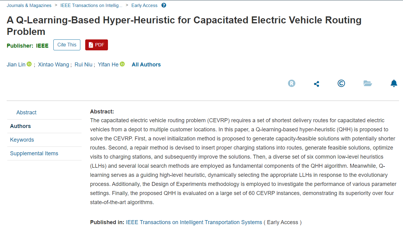 近日,公司21级人工智能专业本科生王鑫涛同学和牛蕊同学在林剑教授、何以凡博士的共同指导下,在智能交通领域国际顶级期刊《IEEE Transactions on Intelligent Transportation Systems》(IEEE T-ITS)上发表题为《A Q-Learning-Based Hyper-Heuristic for Capacitated Electric Vehicle Routing Problem》的研究成果。IEEE T-ITS是中科院TOP期刊,同时也是CCF-B类期刊,王鑫涛同学和牛蕊同学分别为本文的第二、第三作者。
