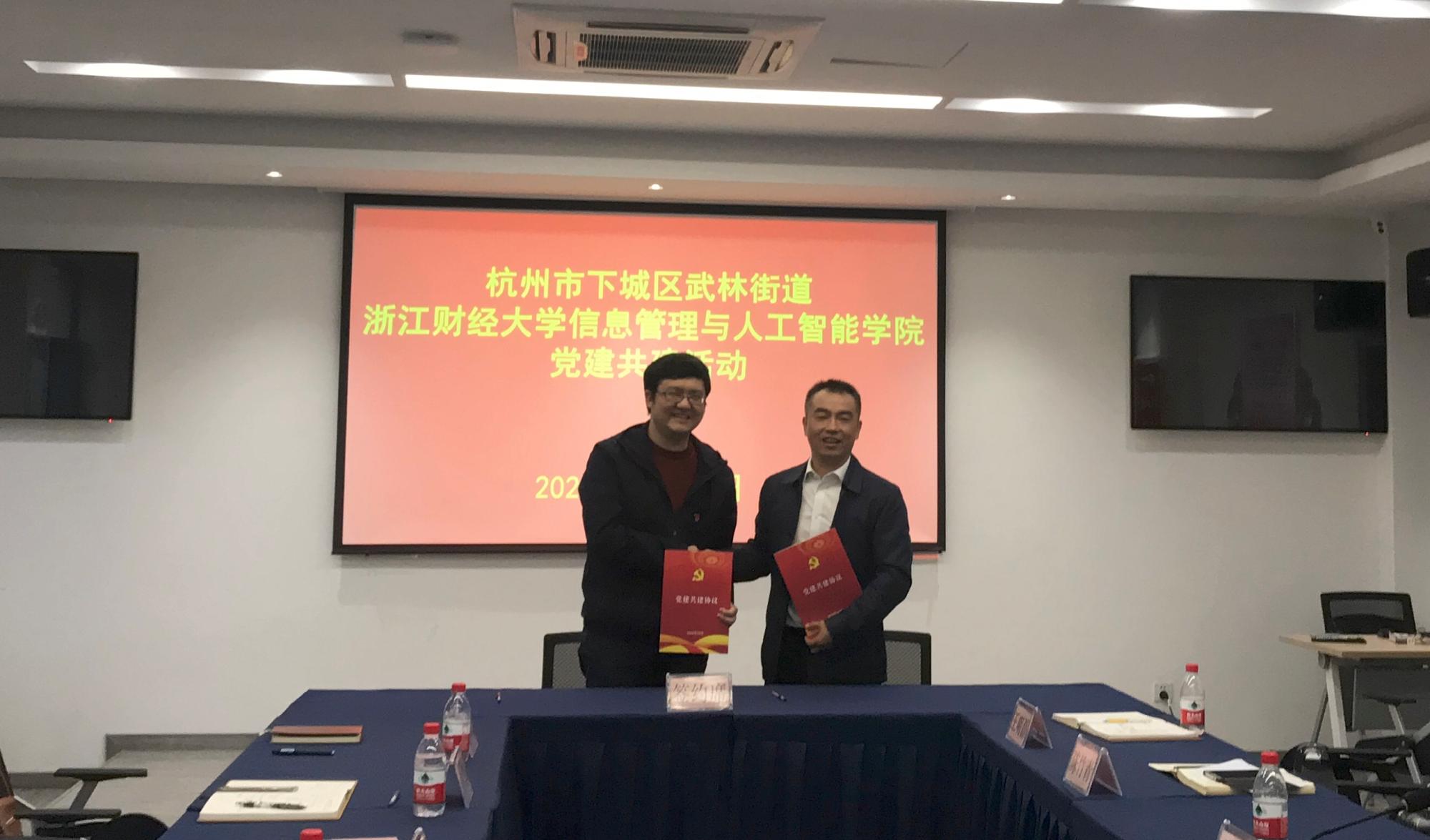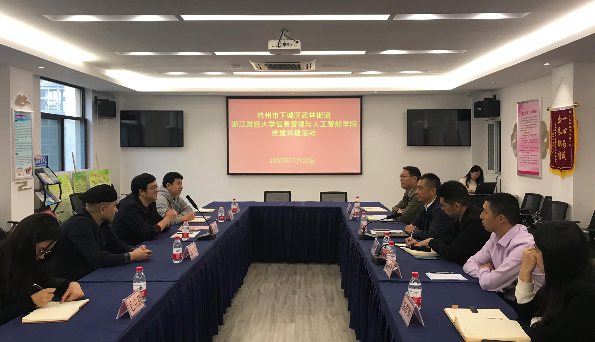 随后,双方党委在武林街道党群服务中心会议室开展了党建共建活动。公司党委书记徐奇伟介绍了公司的基本情况、学科优势和特色党建工作,并希望能在教工和员工两个层面,从社会实践、志愿服务、技术交流、人才合作等多方面加强与武林街道党工委的交流合作。武林街道党工委书记唐国宏介绍了街道党工委如何借助党群服务驿站,在优化“武林店小二”平台服务、疫情复产复工、民生保障服务、智慧养老服务、数字街道综合、武林非遗市集、文化家园建设和基层治理等方面推进党建引领工程。另外,公司与会党员老师还就人才培养、社会服务、宣传和团委等工作与武林街道党工委副书记梅育生,武林街道党建办主任、机关党总支书记梁艳生和武林街道团委副书记苏琪骅展开了交流。