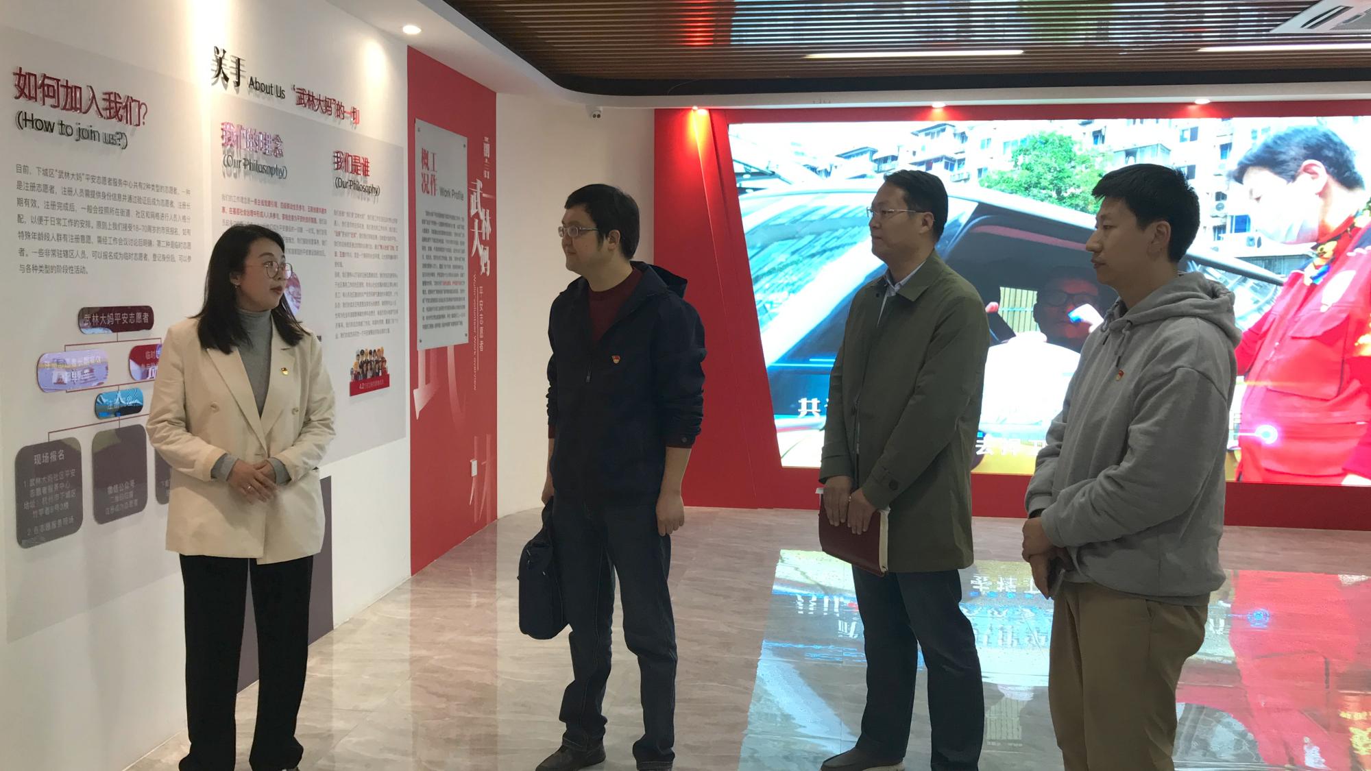 在武林街道党工委委员、组织委员陈竹青和武林街道党政办主任王明磊的引导下,公司党委一行先后参观了武林路国际商业街区党群服务驿站——由8个网红集装箱拼接改造的“武林大妈”微笑亭、武林街道党群中心展厅、武林街道非遗馆和武林街道综治中心数字驾驶舱。在街道党建办、文化站和平安站相关工作人员的讲解中,大家深入了解了武林街道党群服务中心“六个一”工作方法、“六大员”作用机制和“五个零”工作目标,武林街道的历史和非遗文化以及智能化数字化的街道综治模式。