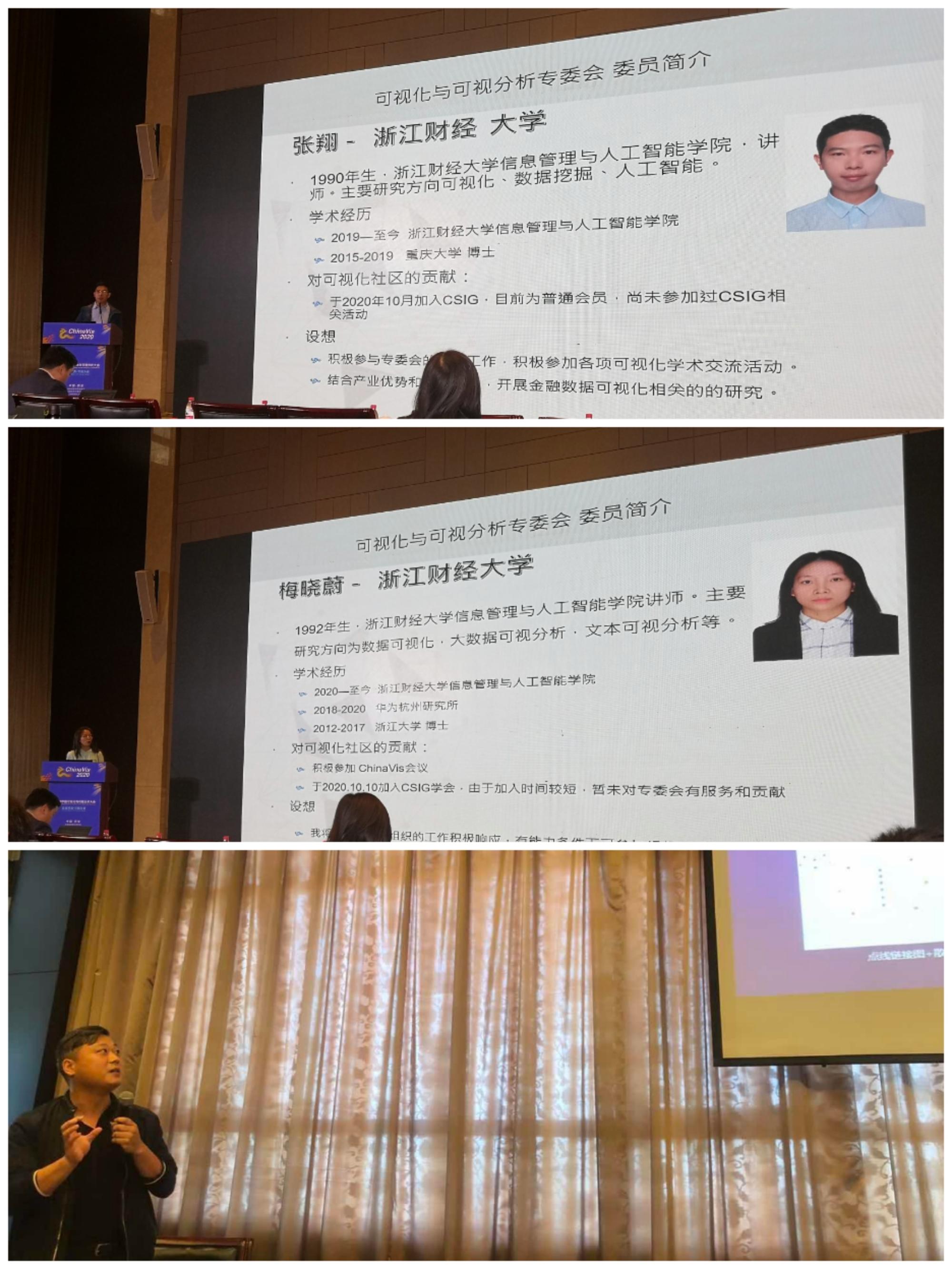 公司张翔、梅晓慰老师向可视化与可视分析专业委员会提交了自己的新进委员申请,并在会议上向各位委员介绍了自己的研究方向和已有相关成果。刘玉华老师在“网络与图”专题会议上宣读了大会录用的“多元网络可视分析综述”论文,并与现场同行专家进行了交流互动。