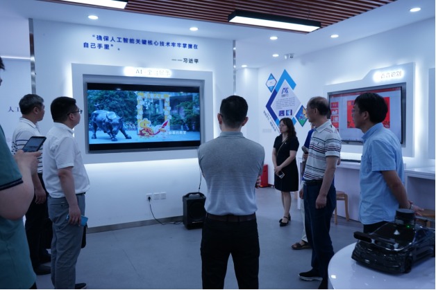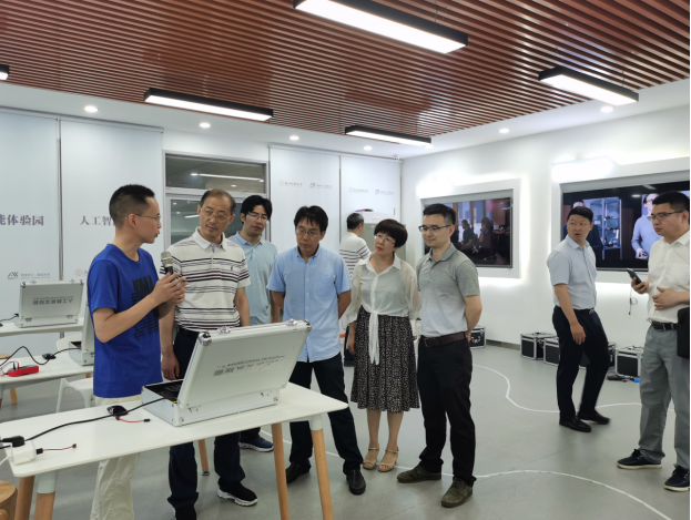 实验中心姜海银老师向来访嘉宾介绍了公司人工智能体验园的发展历程、项目构成、教学与实践安排,分享了人工智能体验园运行安排以及所开展的机器人讲党史、VR红色之旅和机器人走长征等党建活动。
