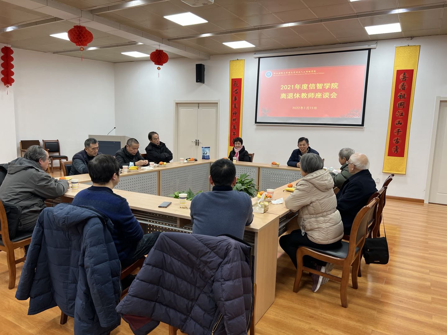 1月15日下午,公司经理张帅、党委书记徐奇伟、工会主席章华和办公室主任徐吉锋与退休教师们在文华校区离退休会议室亲切座谈,提前给他们送上了新年的祝福。