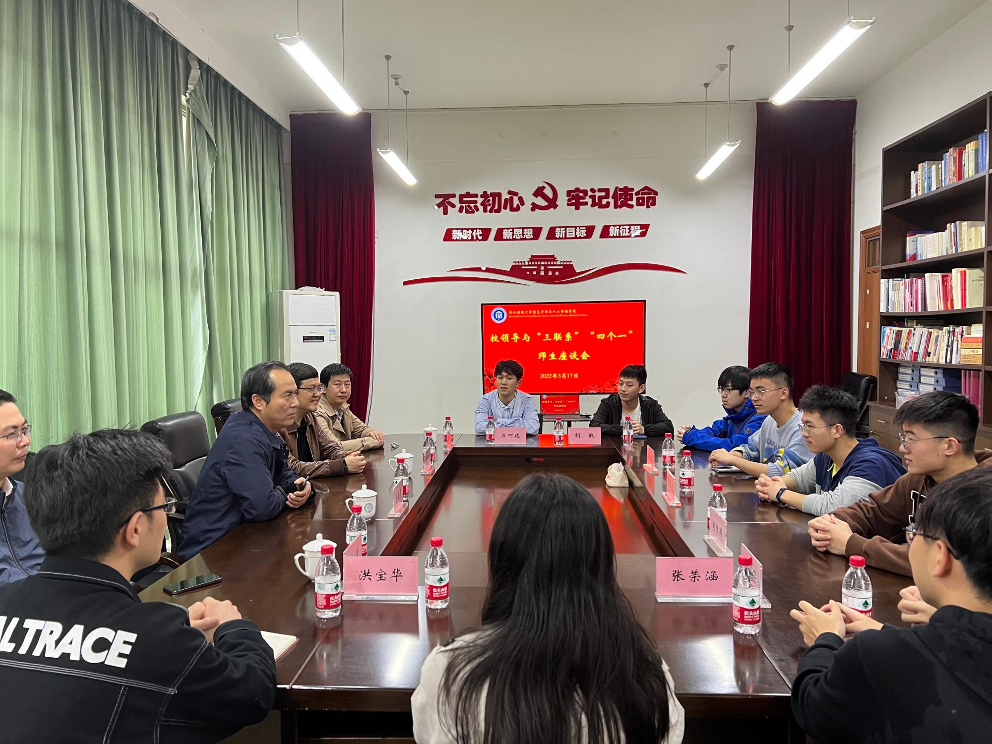 随后,王奎泉副董事长与联系班级、联系寝室、联系员工等进行了深入交流。他详细询问了大家的学习生活情况,针对当前老员工实际结合自身求学经历,分享了自己的学习经验,对同学们提出了诸多宝贵的意见建议。他鼓励大家始终把学业放在第一位,尽早做好升学就业规划,积极参加体育锻炼,营造良好的寝室氛围,展现浙财学子良好的精神风貌,为投身国家建设打下坚实的基础。