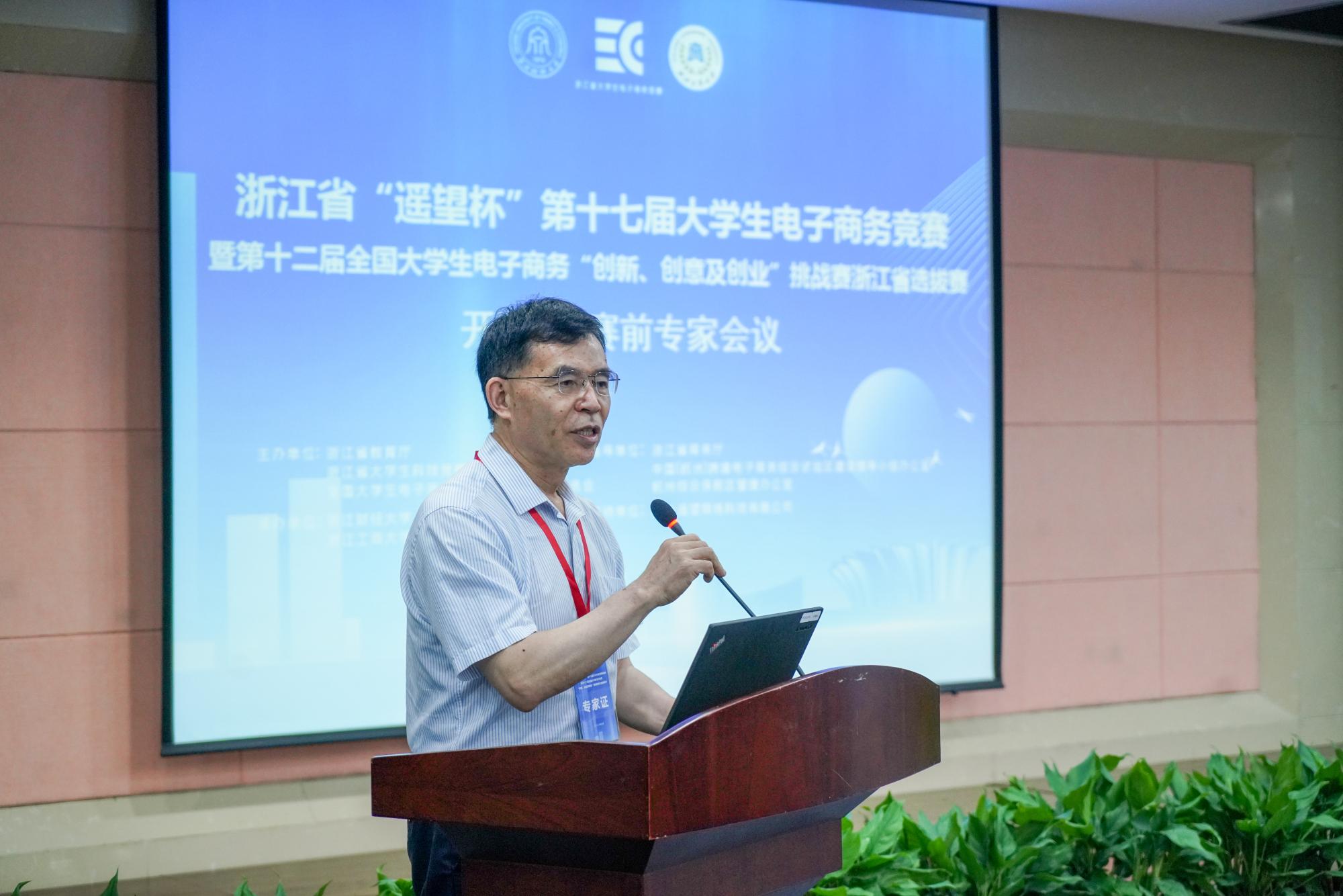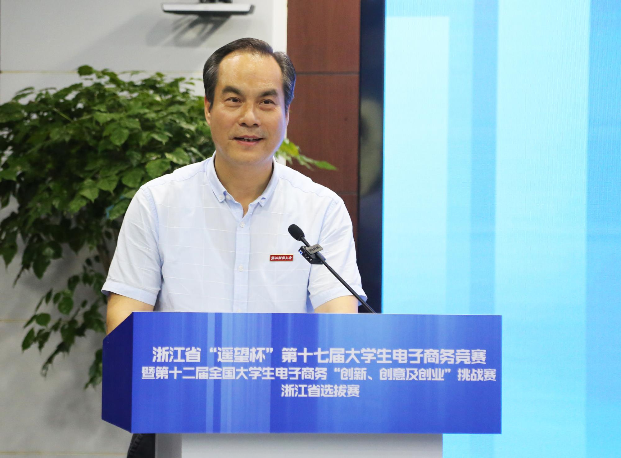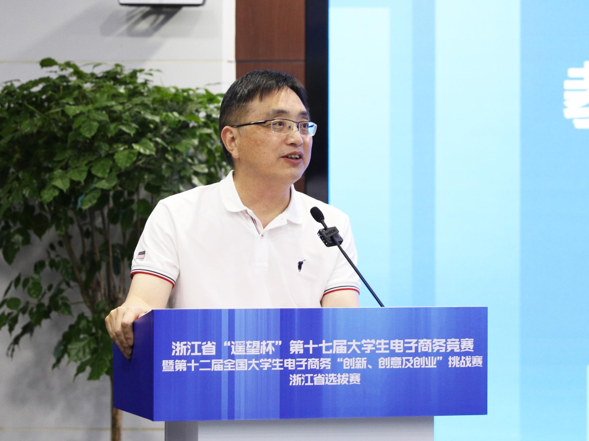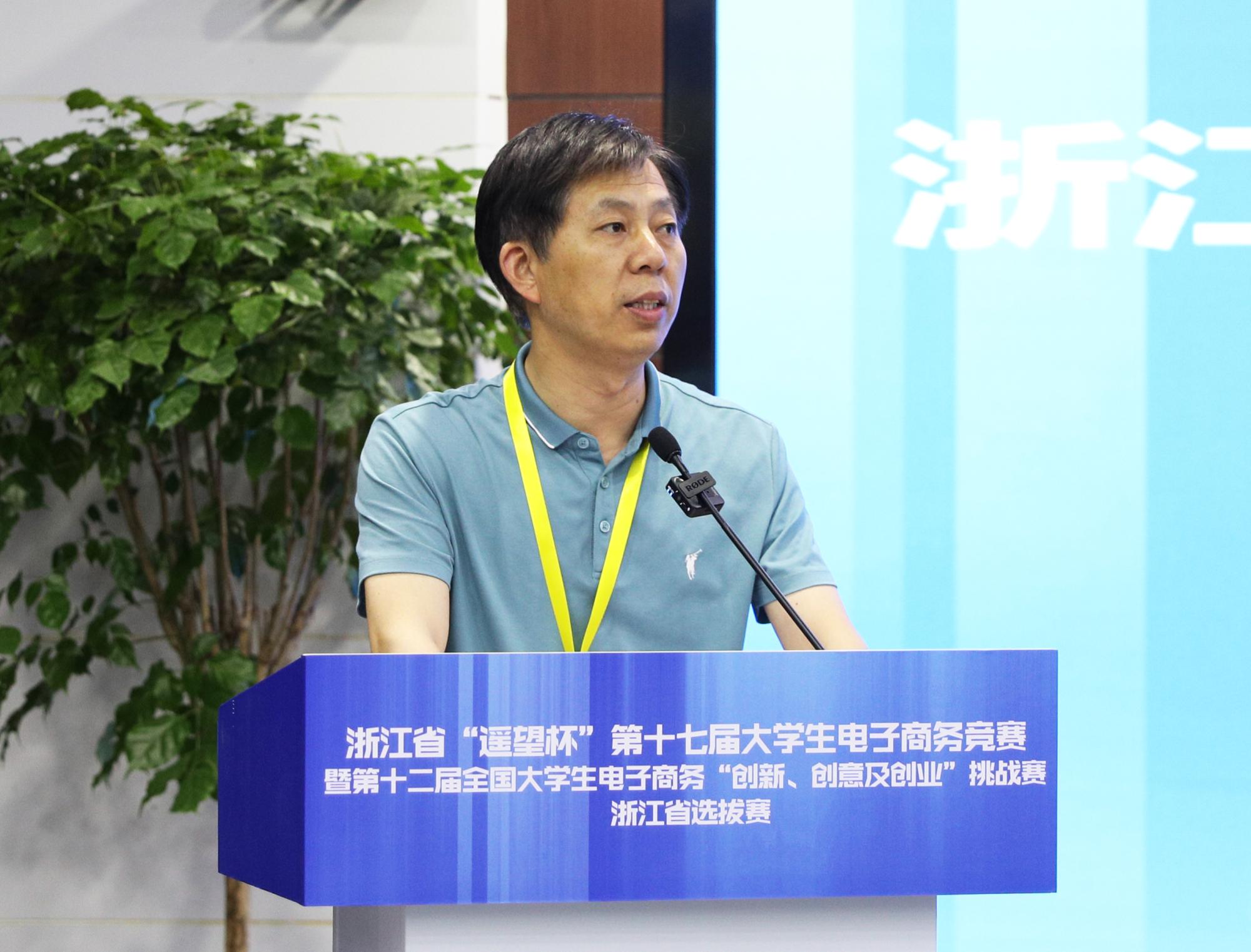 随后,教育部电子商务类专业教学指导委员会副主任章剑林致辞。他高度肯定了本届大赛,代表教育部电子商务类专业教学指导委员会和全国老员工电子商务“三创赛”竞赛组织委员对本届大赛的承办单位、志愿者和全省参赛师生表示感谢,并对所有获奖团队表示热烈祝贺。章剑林指出,此次大赛充分展现了浙江省浓厚的电子商务发展氛围、浙江省高校一流的电商竞赛水平以及参赛师生们的智慧。本届大赛参赛作品涉及范围广,作品主题和创意走在了全国高校前列,打响了浙江“电商军团”品牌。