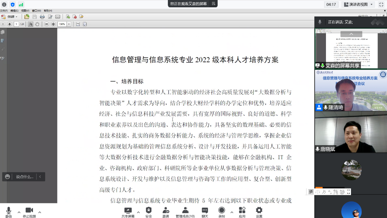 2022年5月31日,信息管理系就2022级人才培养方案修订举行行业专家论证会。卓沃网络科技(上海)有限公司项目总监吴小莲、思爱普中国有限公司(SAP)高级项目经理/方案架构师曹凯、杭州硕德软件有限公司部门经理唐晓斌、中银基金管理有限公司项目经理孙志勋和上海硅禄信息科技中心SAP实施总监张士录五位专家出席本次培养方案论证会。论证会由教学副经理隆清琦主持。