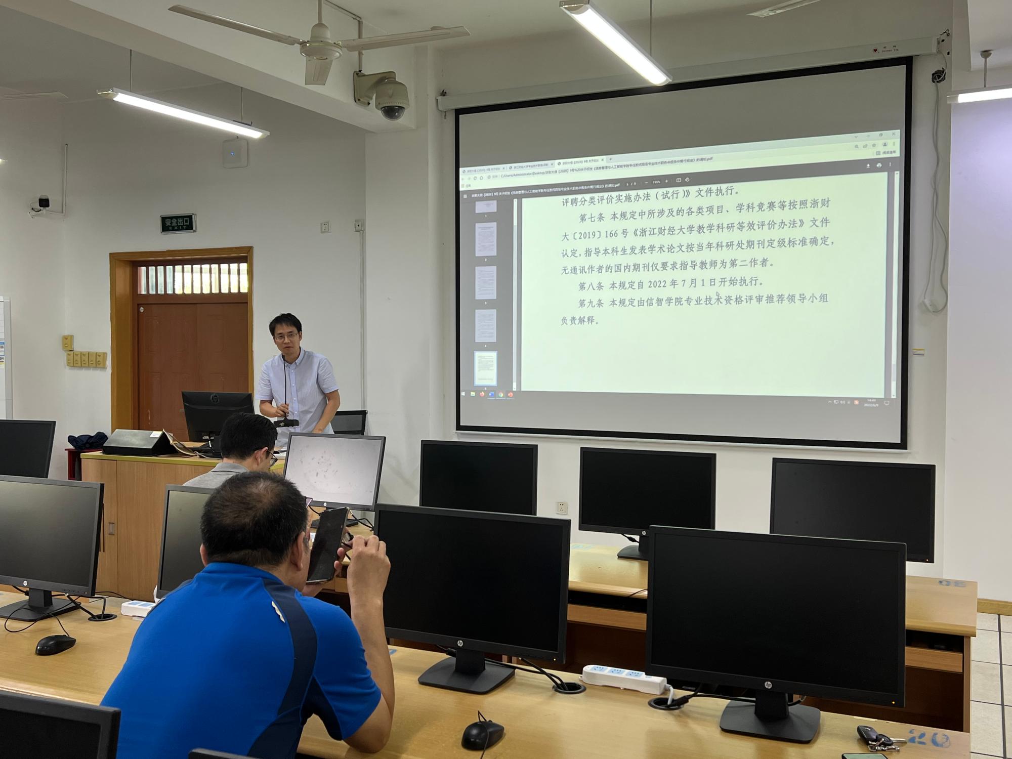 陈远高副经理讲解社会导师聘任相关要求,为参会教师解读《永利yl23411官网专任教师高级专业技术职务申报条件暂行规定》重点条款与注意事项,着重提醒了文件执行时间节点。