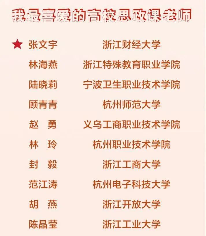 近日,中共浙江省委宣传部、中共浙江省委网信办、浙江省教育厅公布了第三届“思政星课堂”——我最喜爱的思政课老师推介宣传活动获奖名单。在公司推荐、员工推荐和老师自荐的基础上,经专家评审、网络投票等环节,张文宇等10位老师被评为“我最喜爱的高校思政课老师”、林玮等10位老师被评为“高校优秀思政课老师”。