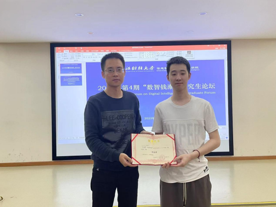 经过点评老师的合议,最终评选出了本期论坛的优秀分享者——胡书逸同学,并由隆清琦副经理亲自为他颁奖。
