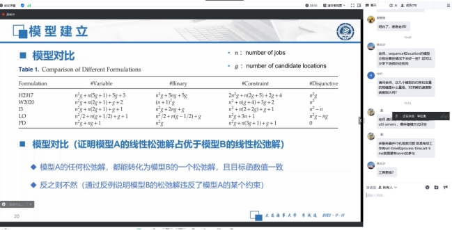 11月1日晚,大连海事大学航运经济与管理公司李延通副教授应邀为公司研究生做学术报告,李教授分享的主题是“Noval formulation and logic-based Benders decomposition for integrated parallel machine scheduling and location problem”。公司张树柱老师与研究生团队参加了讲座,线上参与人数大约七十余人。讲座由信管系张树柱老师主持。