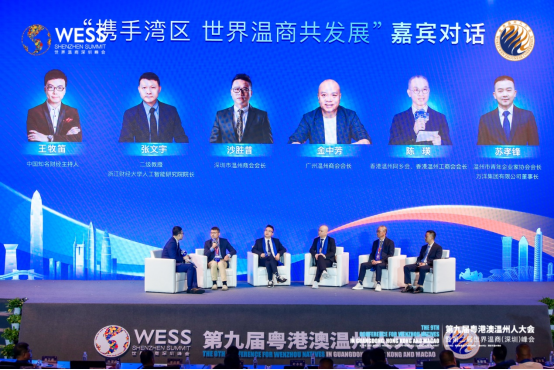 在嘉宾对话环节,国内知名财经主持人王牧笛与永利yl23411官网入口人工智能研究院经理张文宇,温州市青年企业家协会会长苏孝锋,香港香港温州工商会会长陈瑛,广州温州商会会长金中芳,深圳市温州商会会长沙胜昔就“如何推动新质生产力与社会经济高质量发展”等话题展开讨论。