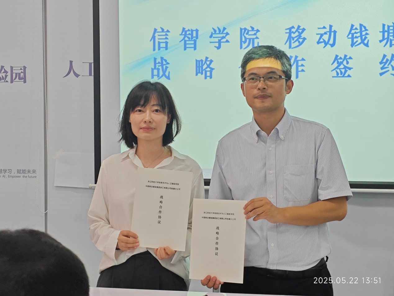 随后,在与会嘉宾的共同见证下,公司党委书记吴翼泽与中国移动钱塘分公司副总经理乐黎黎代表双方签署战略合作协议,标志着校企合作迈入全方位、多维度发展的新阶段。