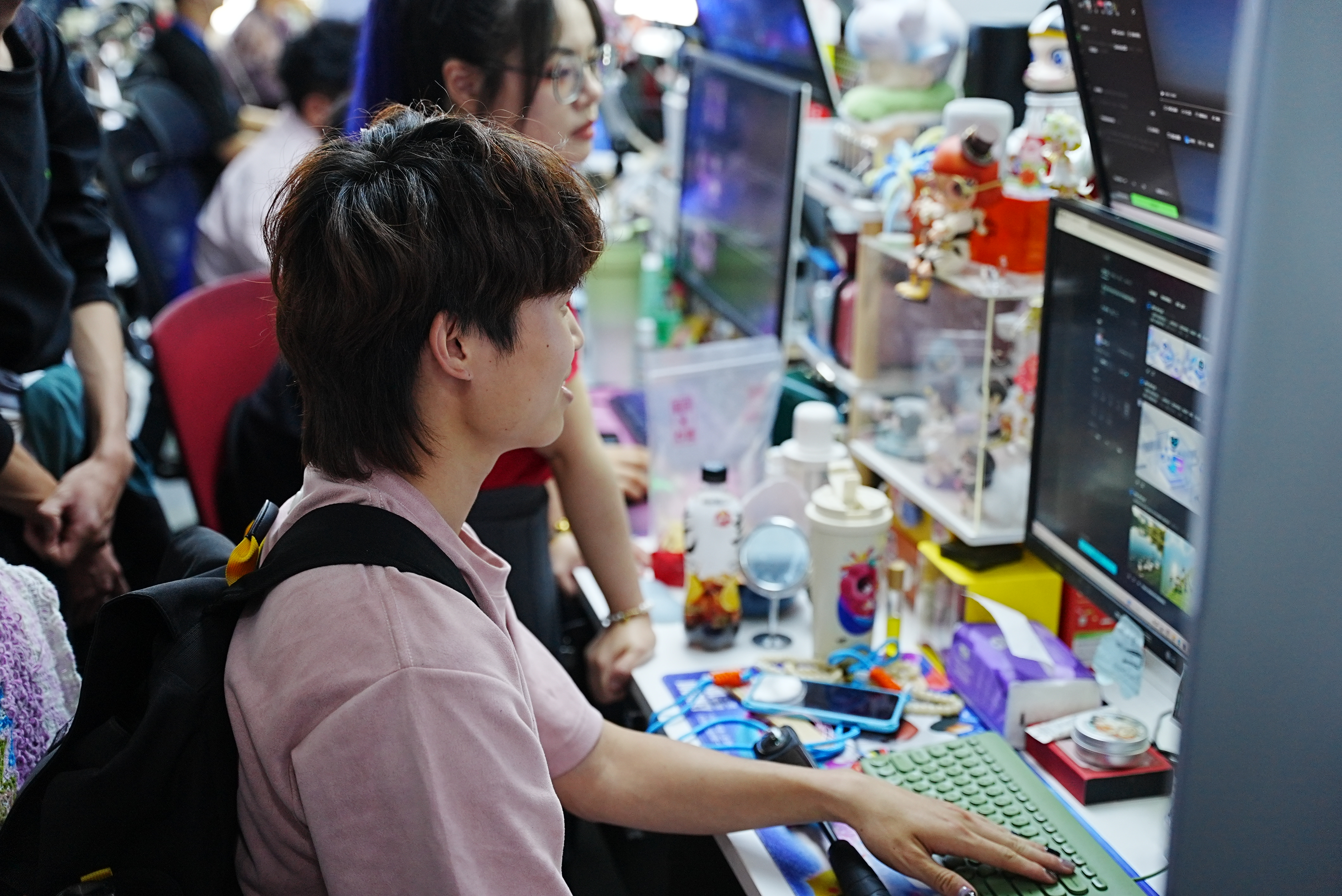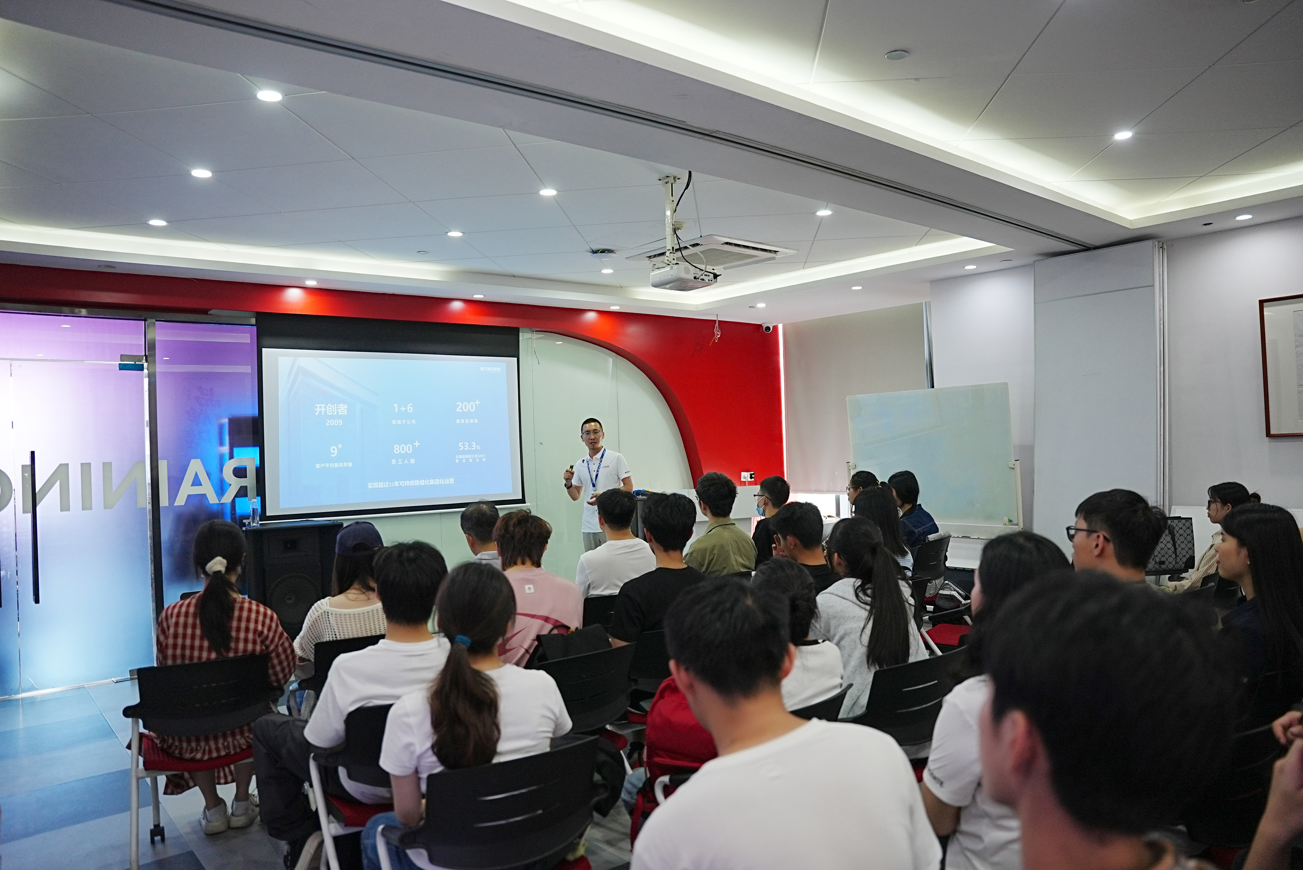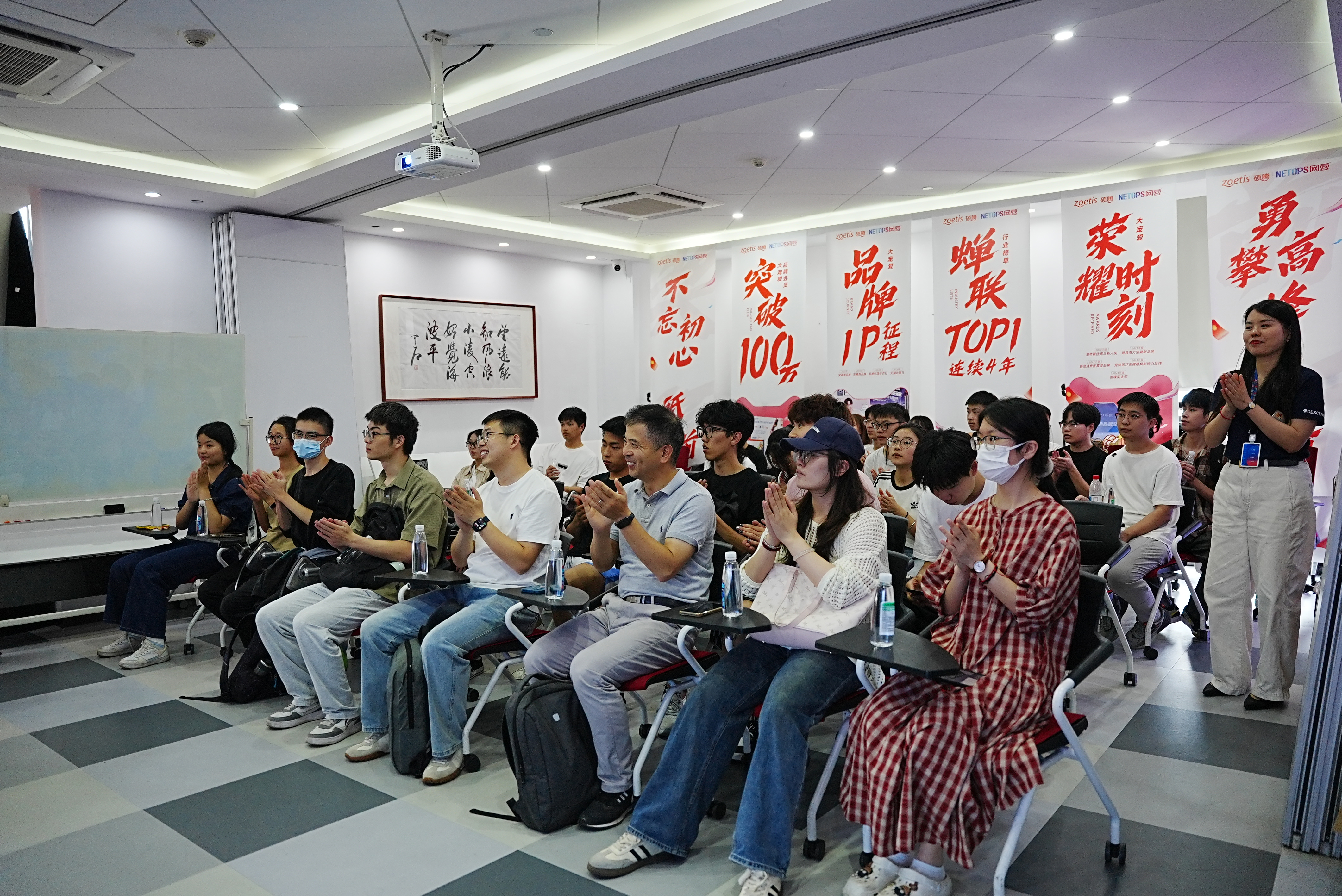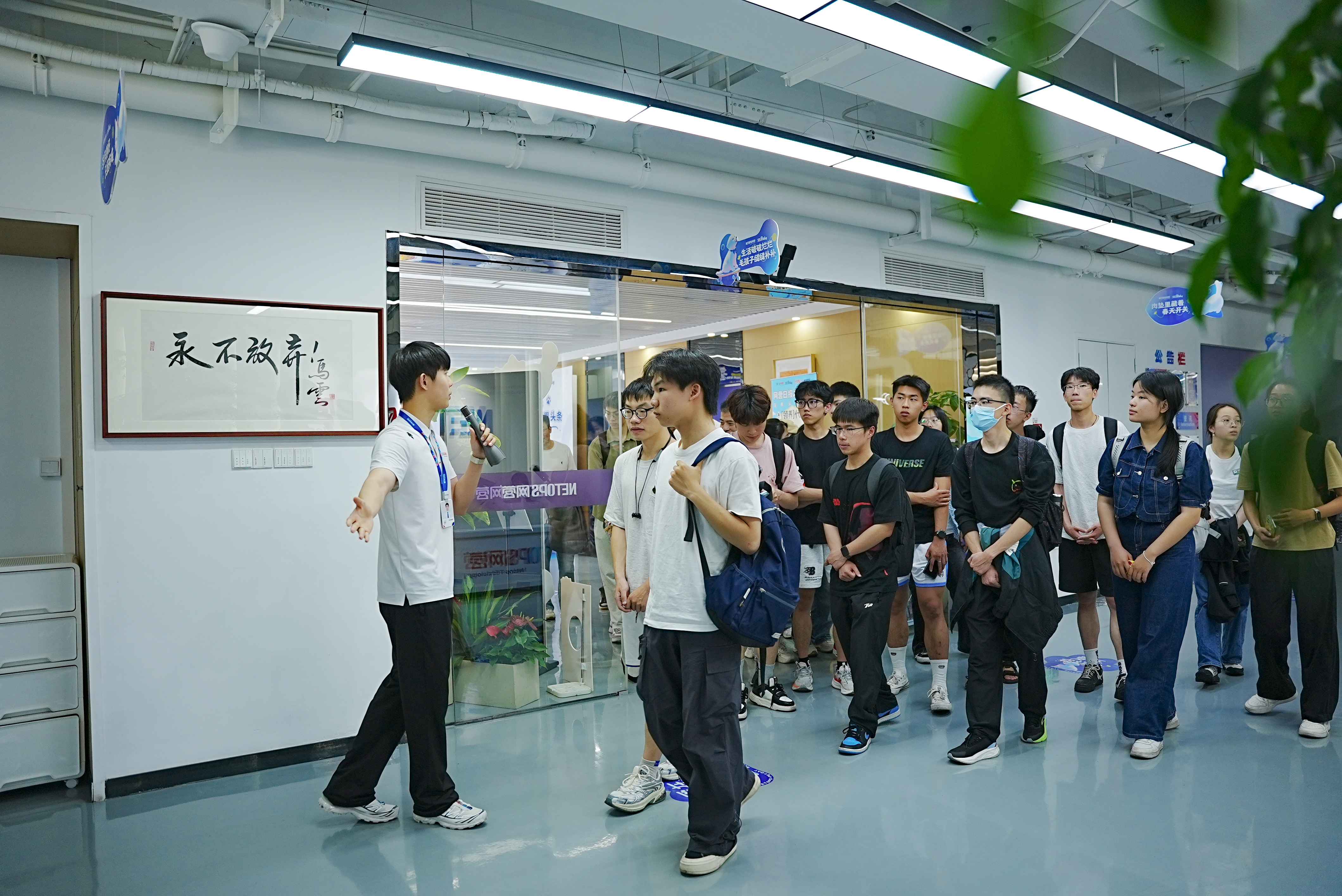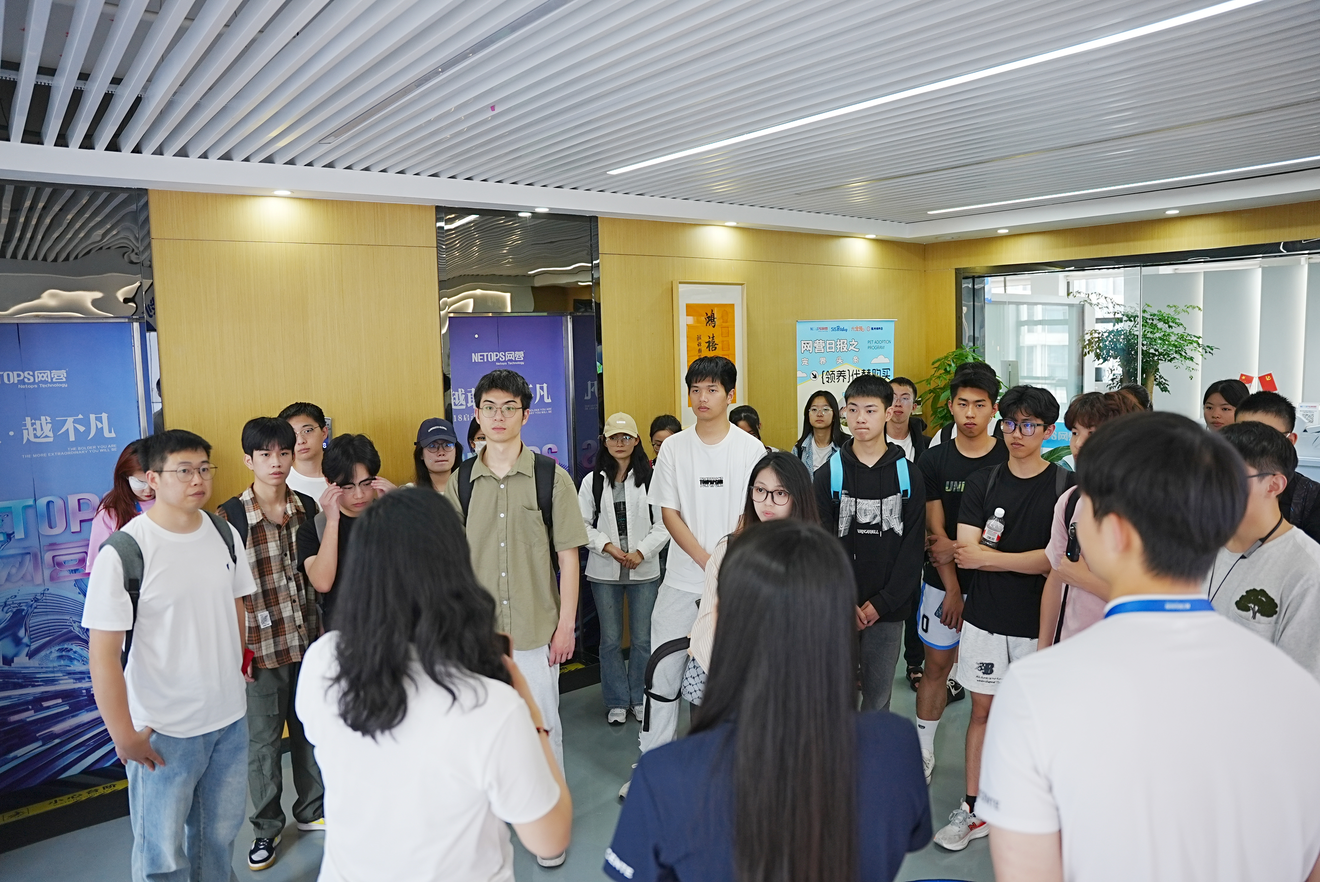 在工作人员的引导下,师生参观了网营科技的办公环境、核心业务展厅及数字化创新实验室。公司负责人详细介绍了企业发展历程、业务布局及在电商服务、AIGC技术应用等领域的特色成果。员工现场体验了AI内容生成工具的操作流程,并参与直播场景模拟实践,直观感受行业前沿技术的落地应用。