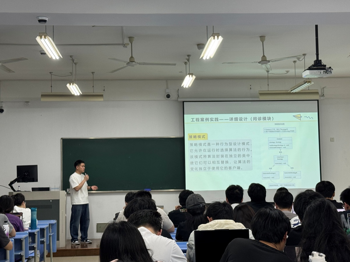 课程开始前,彭老师围绕课程学习现状、实践与理论的关联、企业实践需求与教学介入三个方面展开前期调研,调研数据为本次课程安排和后续课程优化提供了有效依据。基于调研结论,孔老师结合自身经历,从课程回顾、工程案例实践、校园与企业项目差异、求职及考研经历等方面进行细致分享。他着重介绍企业软件系统研发的项目周期与角色协作,并以AI问诊案例,深入讲解需求分析、方案设计、整体设计、详细设计等环节。随后,从代码功能实现角度,通过“拆分代码Bug”“服务器宕机”“流量暴增”“恶意攻击”“大数相乘”5个场景,比较分析校园知识与企业实践的异同。课堂上,员工们认真听讲,不少同学认真记录,积极与孔老师互动。课后反馈显示,同学们对课程中抽象的理论知识理解更加透彻,也掌握了许多实用的工程实践技巧,此次分享有效填补了同学们对企业真实开发场景认知的空白,为后续《软件设计与体系结构》课程的学习打下了坚实的实践基础,也让课程内容与企业实际需求的结合更为紧密。