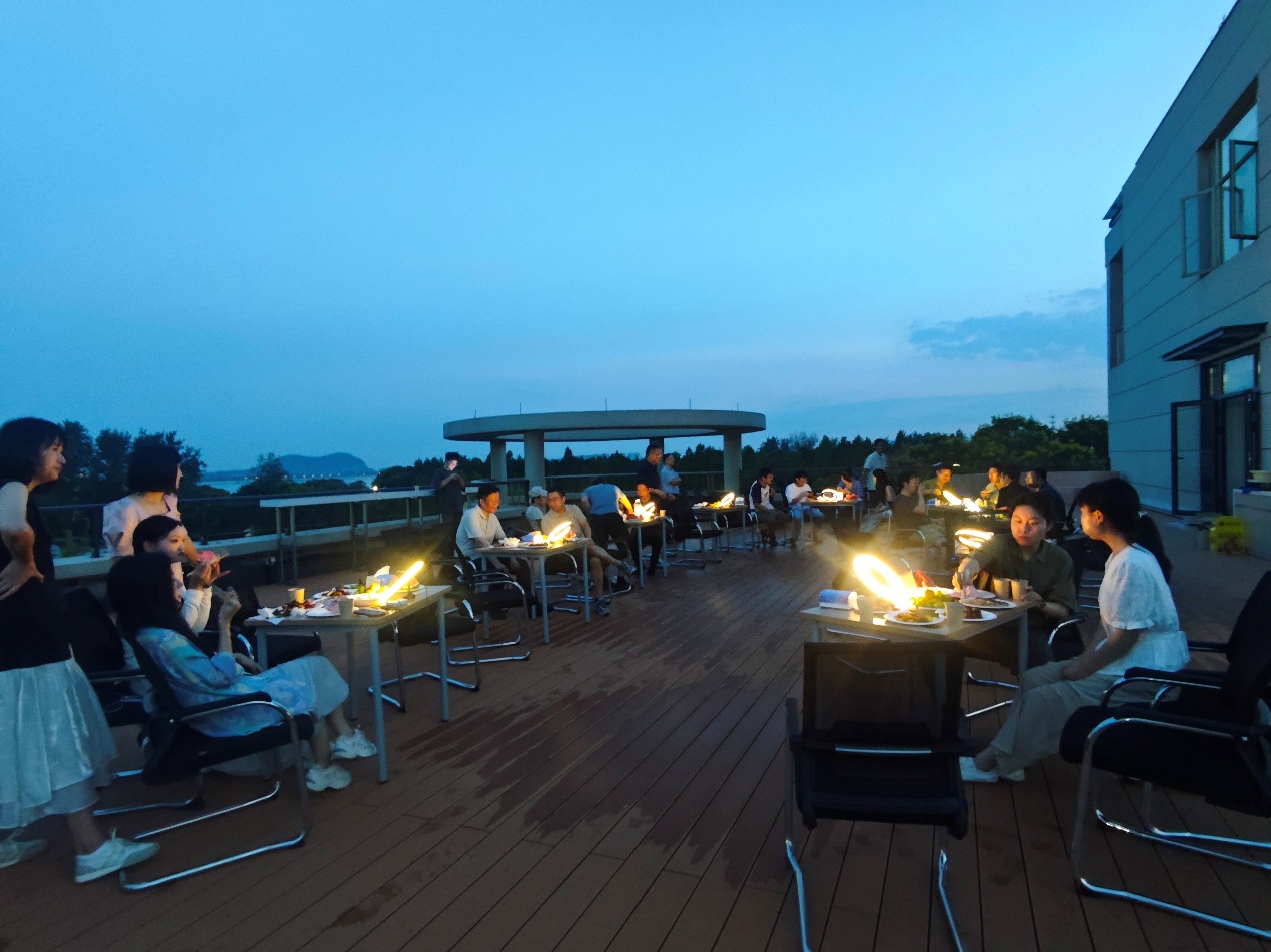 现场暖光氛围灯点缀其间,老师们4-5 人围坐一桌、错落分布,茶品、饮品、新鲜水果、特色小食及热食一应俱全,为秋夜相聚增添了满满暖意。大家伴着秋夜微凉的晚风,眺望着钱塘江景,手捧温热茶盏,卸下日常工作的忙碌。从教学科研中的细碎进展到生活里的趣事家常,从公司的发展变迁到个人的成长感悟,轻松的交谈在月光与灯火交织中自然流淌,彼此的距离在轻声漫语里悄悄拉近。活动期间,还特别安排了九三阅兵回顾视频观看环节。当震撼的阅兵画面在屏幕上徐徐展开,在场教职工无不心潮澎湃,深切感受到祖国的强盛与民族的荣光,爱国情怀与责任担当也随之愈发强烈。