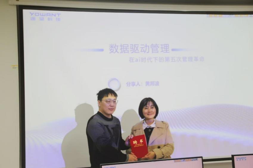 实验室揭牌仪式后,遥望科技技术总监黄邦波以《数据驱动管理——在AI时代下的第五次管理革命》为题,围绕遥望科技的发展历程、数字化到智能治理、复杂任务处理AI框架、业务场景落地等内容为在场师生带来干货满满的数字科技专题讲座。公司副经理朱凌为黄邦波颁发共享导师证书。