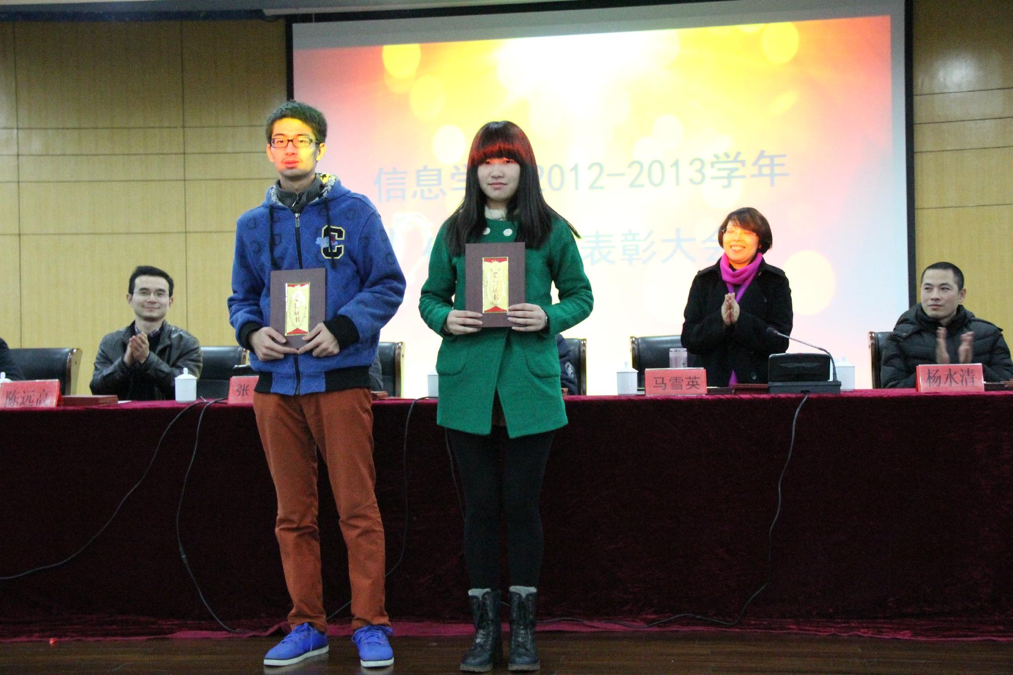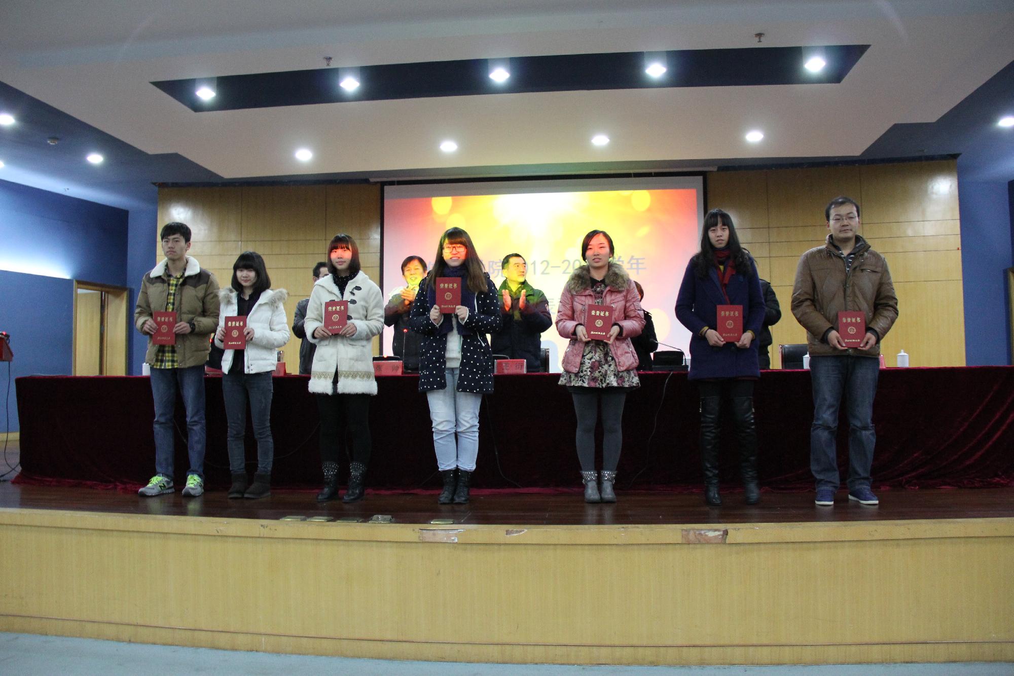 大会表彰了先进团支部、校级社会实践优秀团队等先进集体;表彰了校才苑奖学金、国家奖学金、省级社会实践先进个人、校优秀员工奖学金、三好员工、优秀员工干部、优秀团干部、优秀团员以及院级优秀员工干部、优秀新生班导等奖学金和荣誉称号获得者,并颁发了荣誉证书。