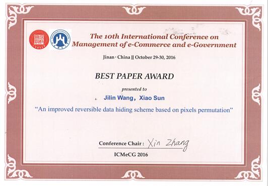 10月28日至10月30日,公司15级管理统计学专业研究生孙啸赴济南参加了第十届电子商务与电子政务管理国际会议(ICMeCG2016),并在分论坛就“An improved reversible data hiding scheme based on pixels permutation”主题做会议报告。经过前期的论文评审和分论坛的专家组评议,包括“An improved reversible data hiding scheme based on pixels permutation”在内的5篇论文获得本次会议的最佳论文奖。
