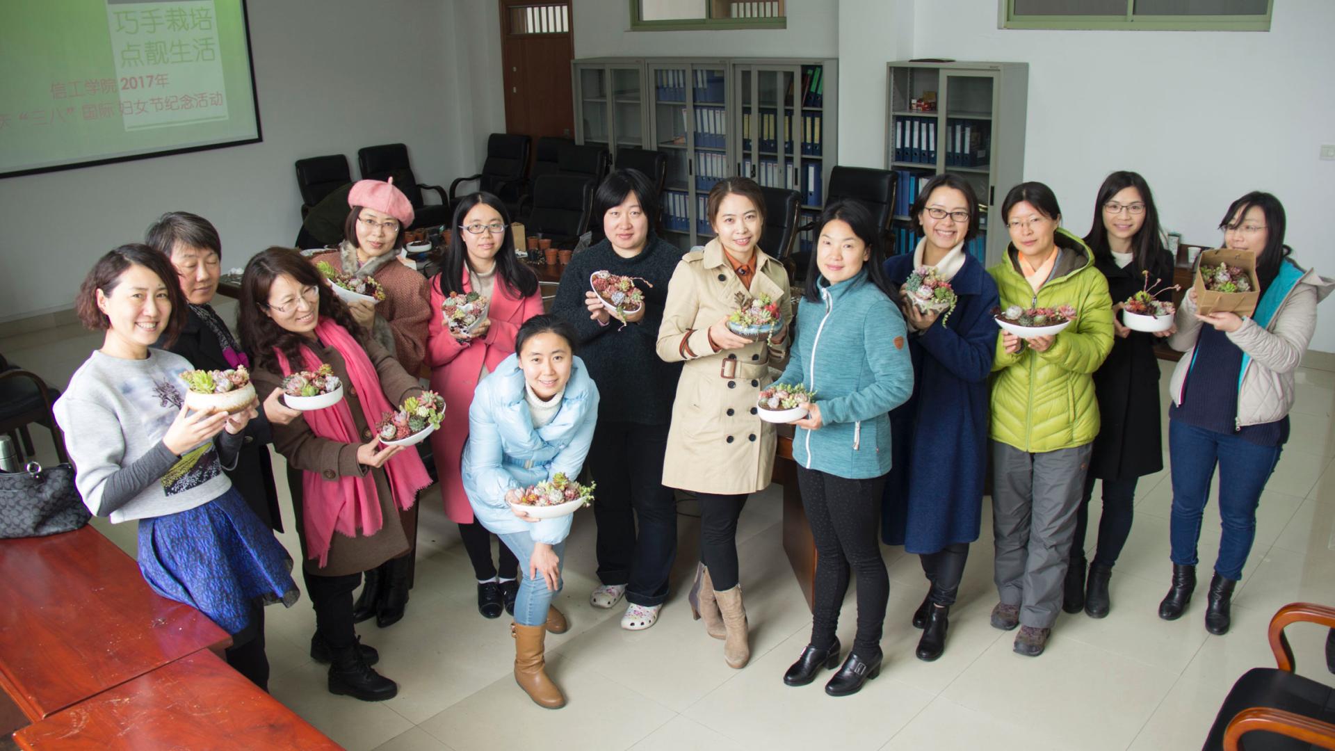 3月16日的下午,女神们热情洋溢的汇聚在9-404会议室,聆听了园艺老师从名称、养护、种植方法等各方面详细讲解后,在既有材料的基础上,发挥自己的想象力,搭配出形态各异,风格不同的小盆景,通过自己的创意使肉肉植物更加活泼生动。老师们围绕在一起,专注于栽培植物,或相互交流,或互相帮助,一片欢声笑语,在愉快轻松温馨的氛围中共同分享节日的快乐.