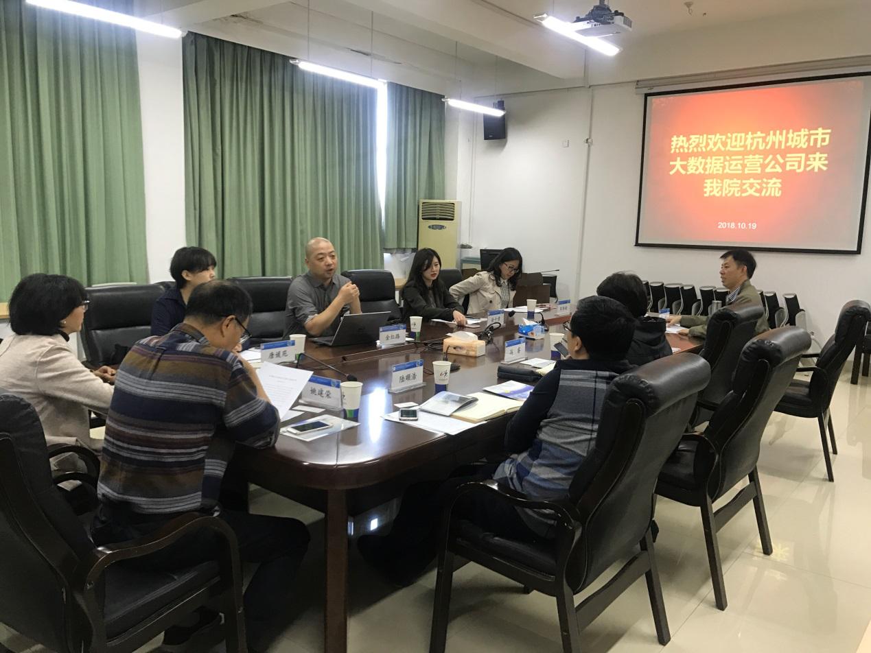 2018年10月19日上午,杭州城市大数据运营公司金红路副总裁、徐千倩副总裁等一行四人来公司洽谈战略合作框架协议,公司党委书记冯睿、副经理张帅、党委副书记陆廷浩、姚建荣教授以及各相关系主任出席了座谈会。