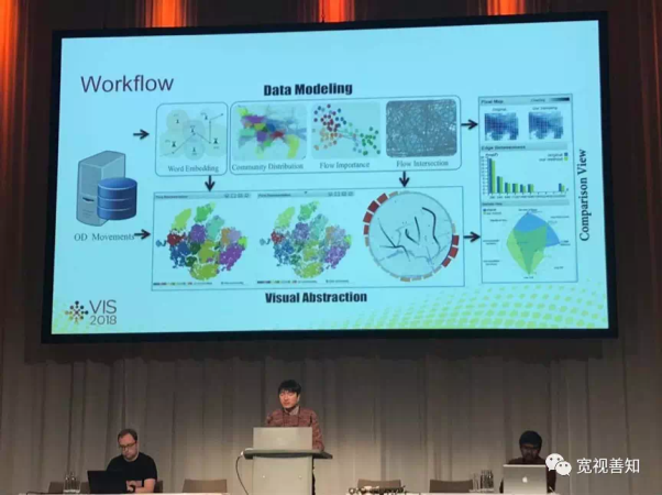 公司信息管理与工程公司软件工程系主任周志光博士,近年来研究方向专注于大数据简化表达与可视分析。本次工作,利用自然语言处理模型计算获取人群轨迹的语义关联,进而实现大规模城市移动数据的采样简化与可视表达,撰写的研究论文“Visual Abstraction of Large Scale Geospatial Origin-Destination Movement Data”,被IEEE VAST录用并做现场报告(Oral Presentation),进一步作为期刊推荐论文(TVCG Track),在线发表于中国计算机学会A类国际期刊IEEE Transactions on Visualization and Computer Graphics(TVCG)。这是公司第一次在IEEE VIS顶级会议上发表论文,也填补了公司近年来在中国计算机学会A类会议和期刊的空白。下图为公司周志光博士报告论文的现场。