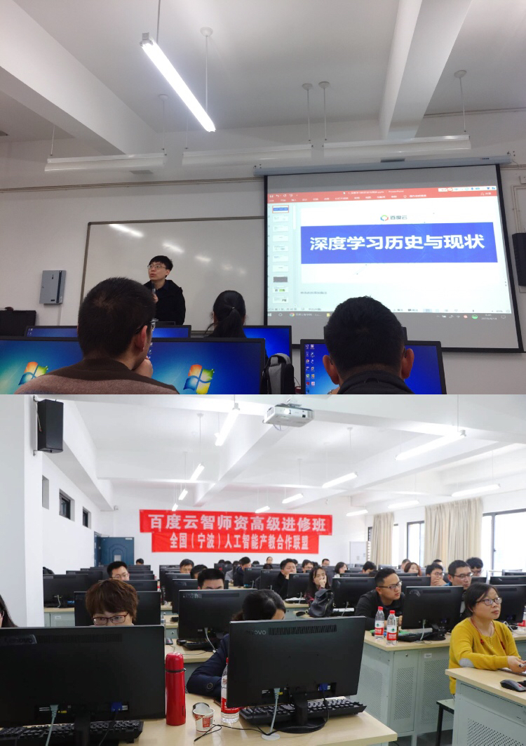 2019年4月12日-14日,信工公司陈圆圆等老师参加了百度云智公司主办,中国(宁波)人工智能产教联盟和百度云智公司宁波分院(宁波青软智能科技有限公司)联合承办的为期三天的人工智能研究与教学培训。培训主要邀请了国家教学名师王万良教授和百度深度学习布道师白浩杰博士分别从人工智能理论和实战两方面进行培训。