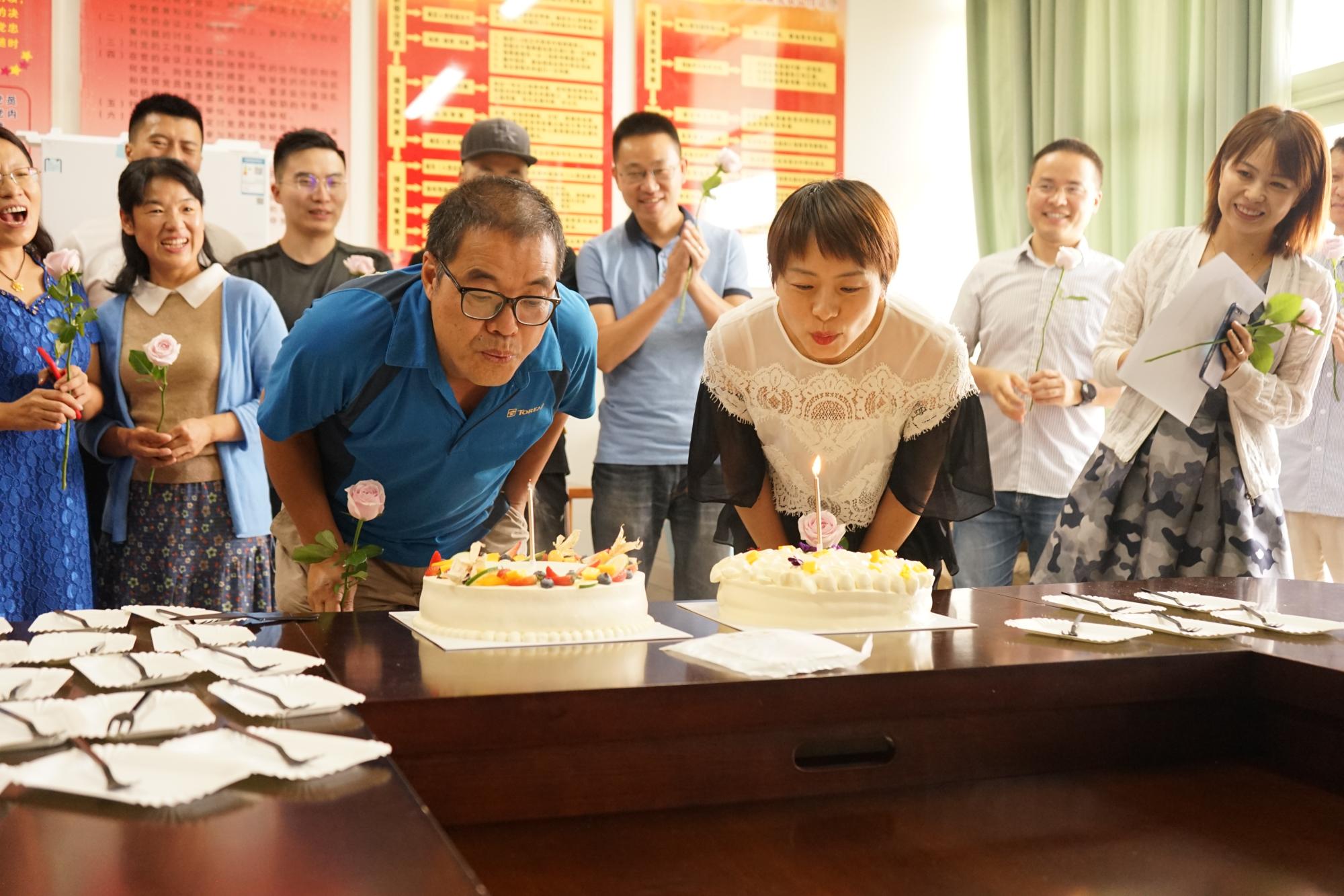 集体生日会由公司党委副书记兼工会主席陆颋浩主持。公司经理张文宇为每位寿星送上鲜花,并代表公司为寿星送上生日祝福。随后,全体寿星一同合唱生日歌,在歌声中一同吹灭生日蜡烛。由寿星代表王继林老师和朱胤老师共同切开生日蛋糕,并为每位寿星分发蛋糕,分享生日的快乐。