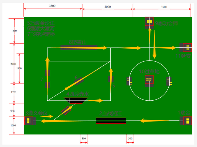 比赛以“重走长征路”为主题,按比赛要求设计并制作机器人软硬件系统,模拟红军长征,让机器人从瑞金出发,过“湘江战役”、“遵义会议”、“四渡赤水”、“强渡大渡河”、“飞夺泸定桥”、“爬雪山”、“过草地”、“懋功会师”等站点,最终到达“延安”。