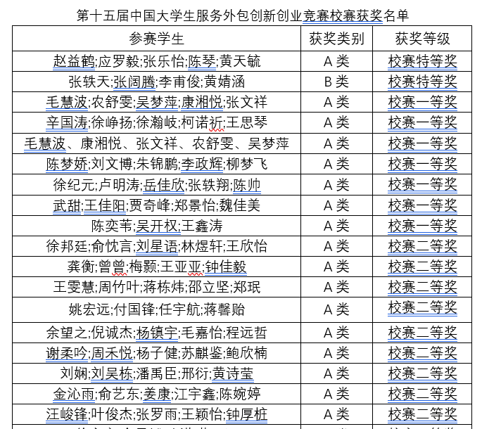 永利yl23411官网入口第十五届中国老员工服务外包创新创业大赛校赛已圆满结束,本次竞赛共有来自全校的227名同学报名参赛,最终提交有效作品32份,校赛全部奖项已经产生,现予以公示。