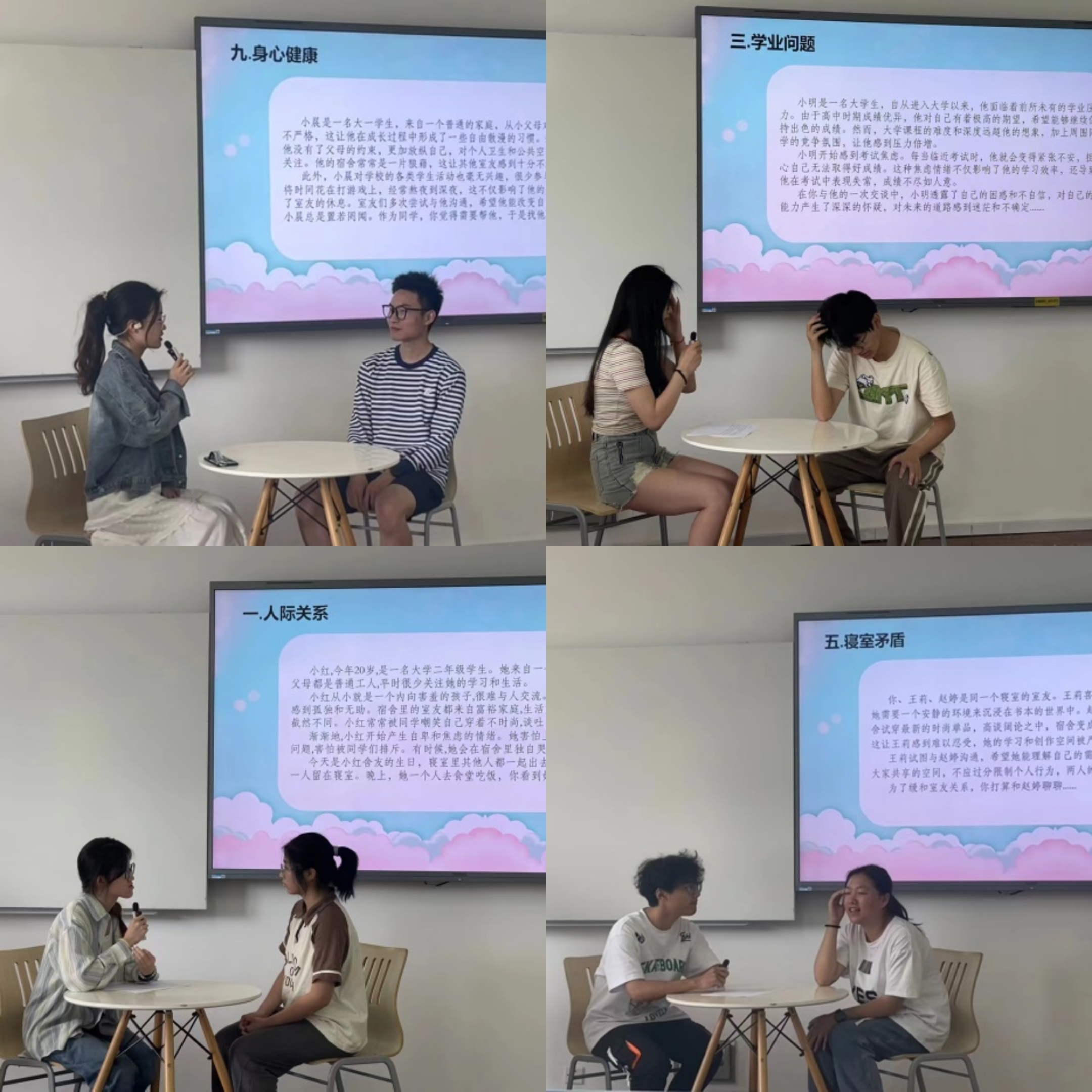 比赛中,选手们和演员们以精湛的演技和生动的剧情,展示了当代老员工容易遇到的各种心理问题。无论是寝室关系的紧张、亲子朋友的关系,还是考前焦虑的困扰、个人内心的整合,他们都一一呈现。选手们以被辅导人室友、班委、多年好友等朋辈身份,在用智慧与关怀为对方进行开导、安慰和支持的过程中,感受每一个角色的情感波动,真情实感也触动了评委和观众的心灵,不仅让观众们更深入地了解这些心理问题,也引发了同学们对自我成长的思考。