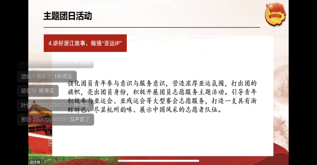 首先,王佳同学向我们介绍二十大精神,并说明如何更好地将二十大阐述的各种先进理念融入我们的日常生活之中,使各位团干部能够以身作则,将二十大精神内化于心,外化于行。