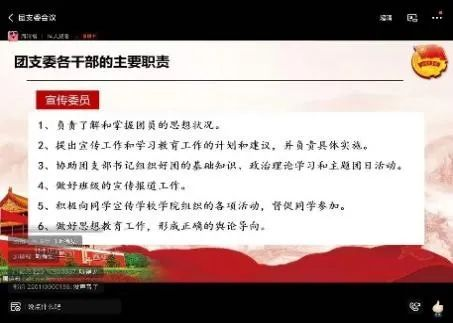 其次,公司团委副书记周诗祺向我们介绍应如何开展智慧团建系统的操作要求,并明确了团支委干部的主要职责,使各委员可以各司其职,使班级团务工作开展顺利。并指出青年大学习的收交要求及活动必要性。对后期如何更好的开展三会两制一课进行指导,强调规范各团支部的推优流程,尽快完成各团支部推优小组的建设,希望各团员干部以饱满的热情和责任建设团支部。希望通过此次团支委会议,加强各团员干部的思想建设,提升团员干部的工作能力,为公司共青团工作新局面奠定良好基础。