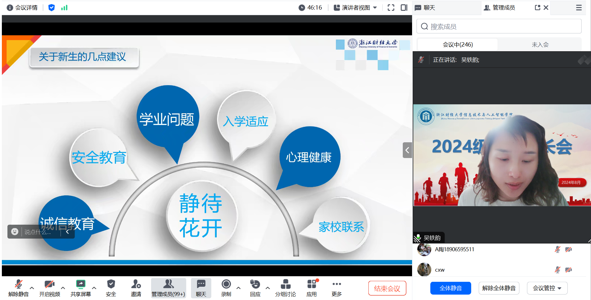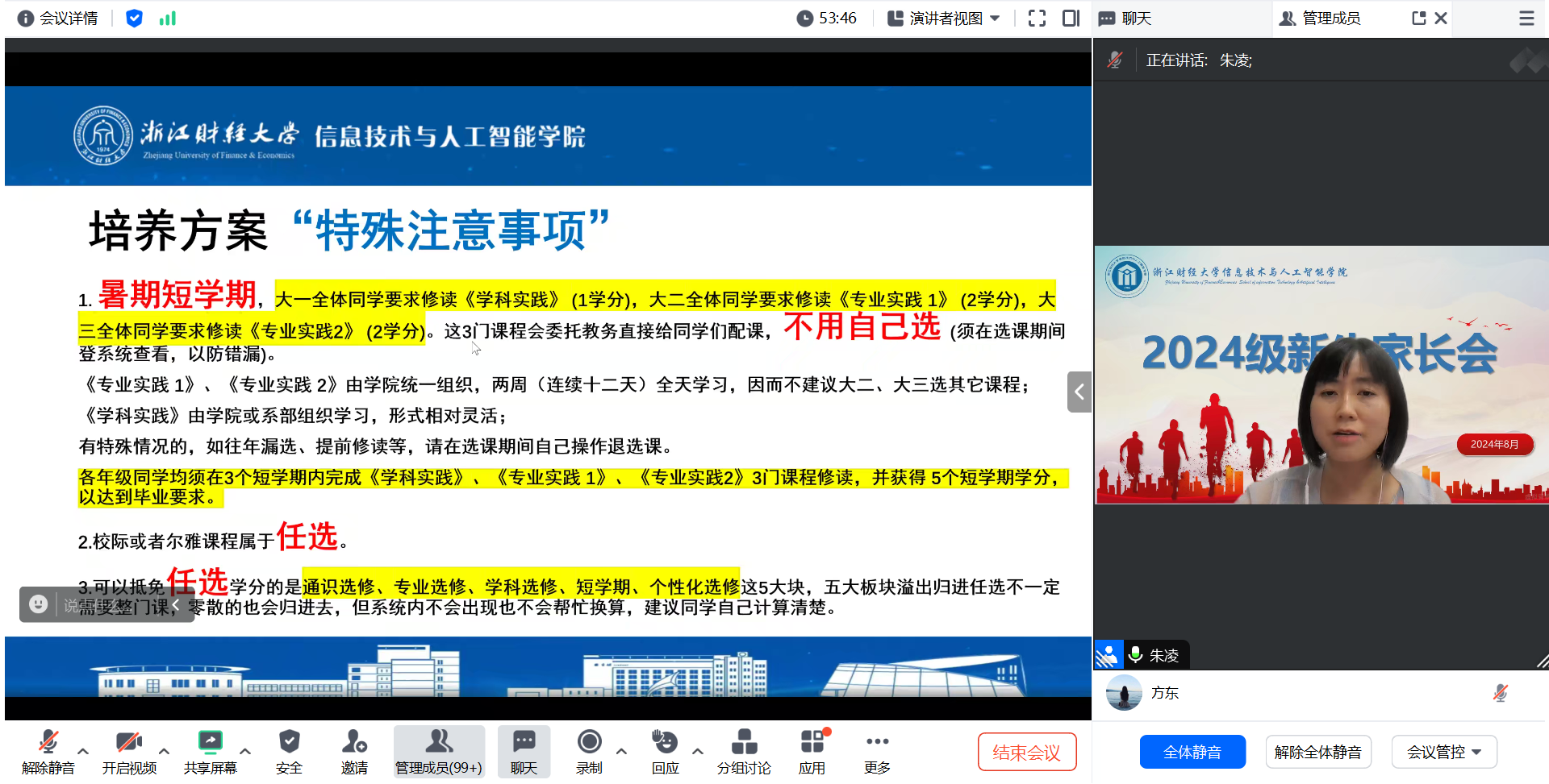 吴轶韵副书记向家长们介绍了公司员工管理制度和“新财经战略”背景下MAQ型“浙财金生”家校协同育人培养路径,并特别提醒临近的入学,开学各项注意事项。