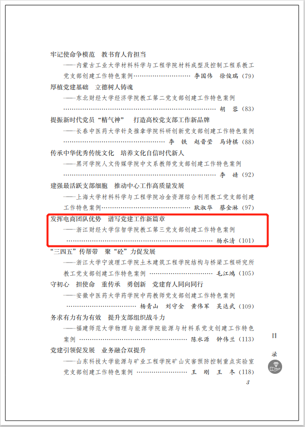 2021年由全国党员教育培训示范基地、华中师范大学培训中心组编的《高校教师党支部党建创新案例精选》一书,经华中师范大学出版社正式出版全国发行。其中由支部书记杨水清撰写的教工第三党支部典型做法《发挥电商团队优势 谱写党建工作新篇章》作为特色案例入选《高校教师党支部党建创新案例精选(第二辑)》。