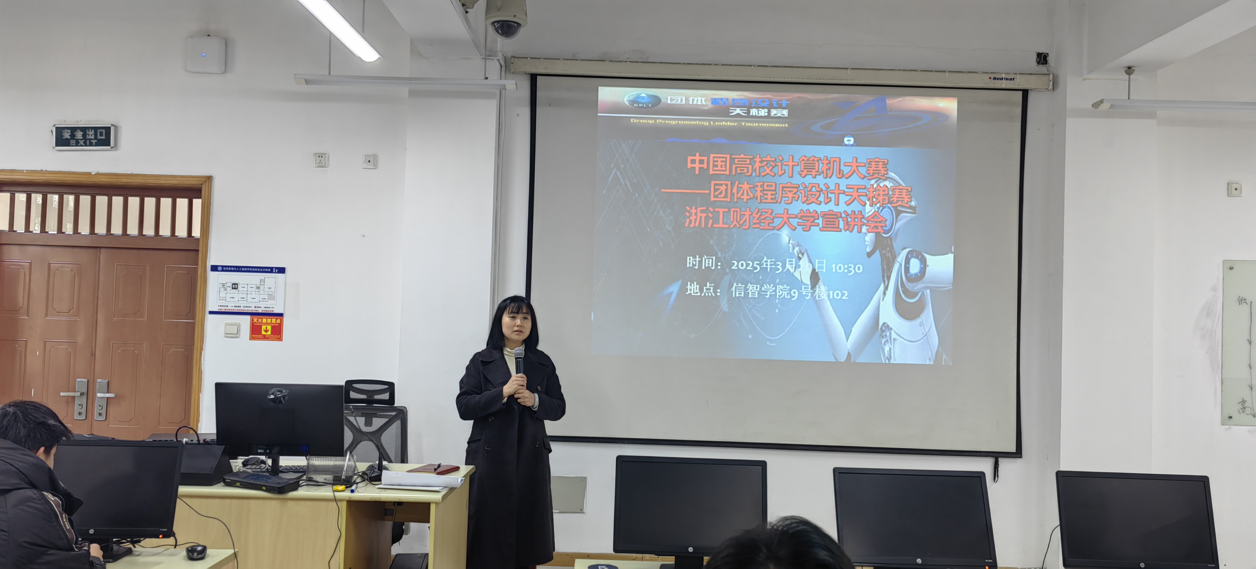 会上,副经理朱凌结合PPT 演示,系统介绍了赛事的背景意义、赛制规则及奖项设置。作为教育部认可的全国性学科竞赛,团体程序设计天梯赛由教育部高等公司计算机类专业教学指导委员会等四大学术机构联合主办,自 2016 年创办以来,已成为国内规模最大、影响力最广的程序设计赛事之一。2025 年赛事将延续 “个人竞技、团体计分” 模式,设置基础、进阶、登顶三个难度梯级,全面考察选手的算法设计、数据结构应用及问题解决能力。