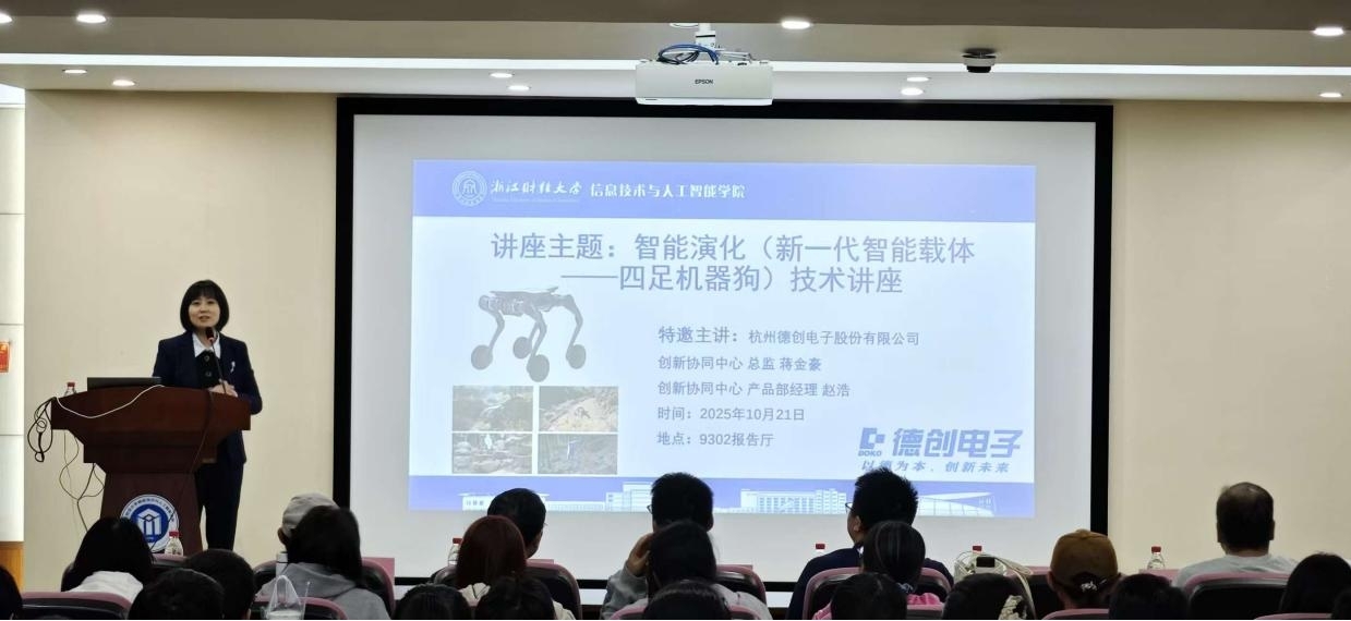 2025年10月21日,公司特邀杭州德创电子股份有限公司创新协同中心总监蒋金豪、产品部经理赵浩,在9302报告厅举办《智能演化(新一代智能载体)——四足机器狗技术讲座》。公司副经理朱凌主持讲座,经理助理/计算机系主任陈明晶、智能物联网及嵌入式开发课程资深教师张后旗、电子电路课程骨干教师杨泽、机器人课程骨干教师张翔等教师及相关本科生、研究生共130余人参与。