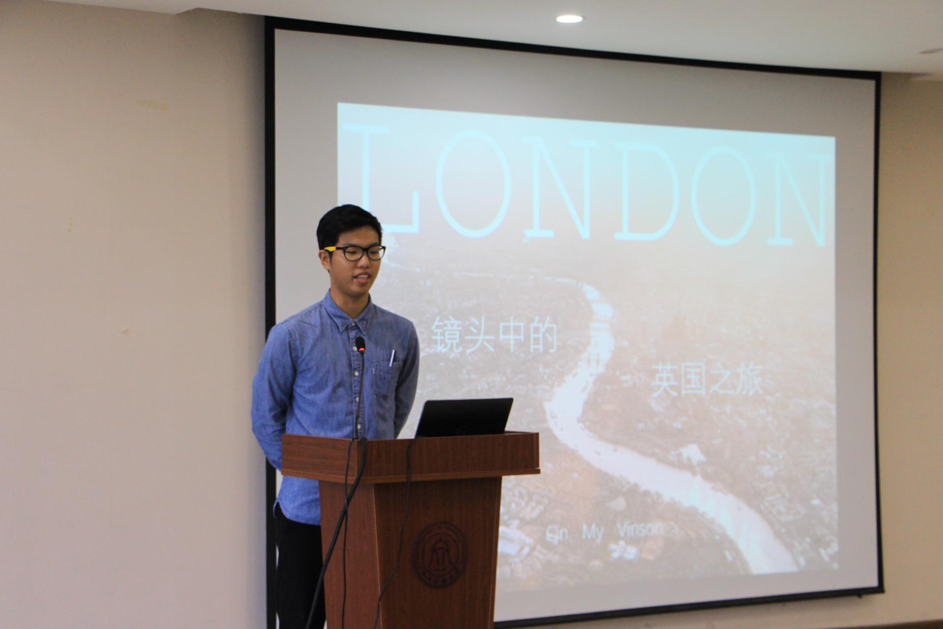 张咪同学以“摘下伦敦夜空的科技之星”为主题结合信息专业的特色,从隐私安全和互联网运用两方面讲述了中西方的种种差异,并向大家介绍了著名的牛津以及剑桥大学。