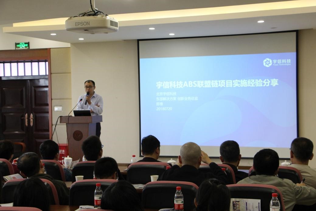 紧接着,是宇信科技高级销售总监周川哲先生与宇信科技东部解决方案中心总监陈锋先生关于区块链项目落地的报告。陈锋为大家解释了区块链,以及区块链项目的情况,并指出:“区块链的关键目标是去中介化,而不是去中心化。”