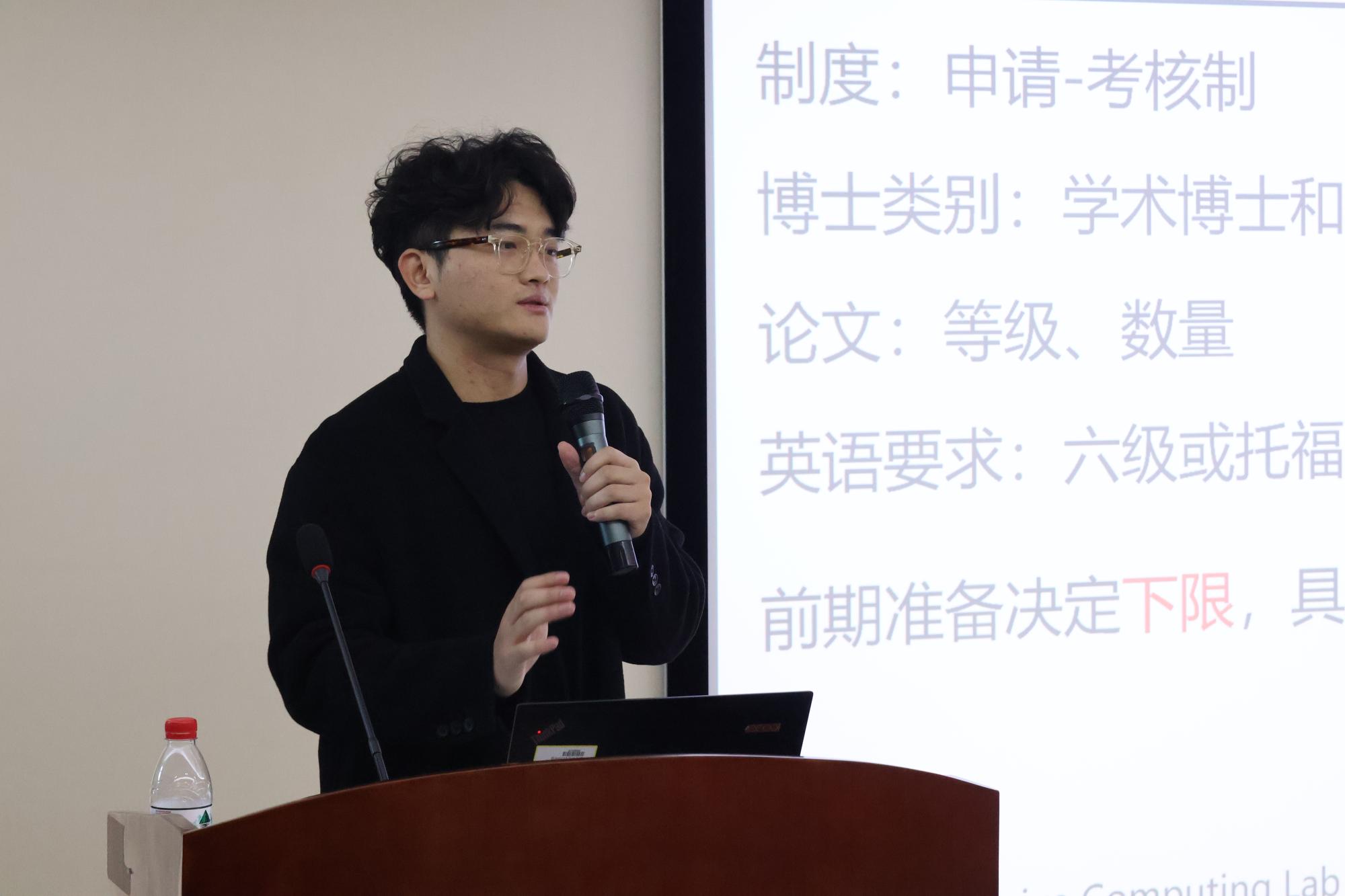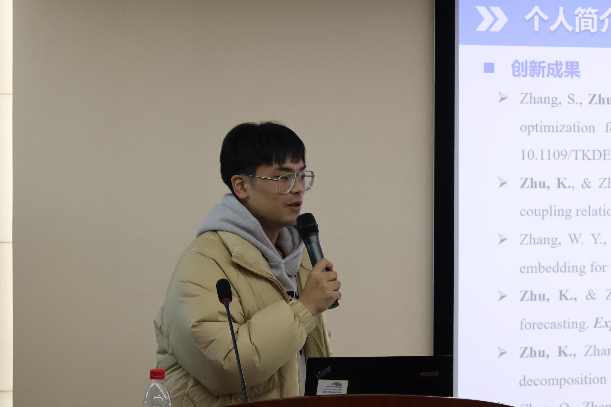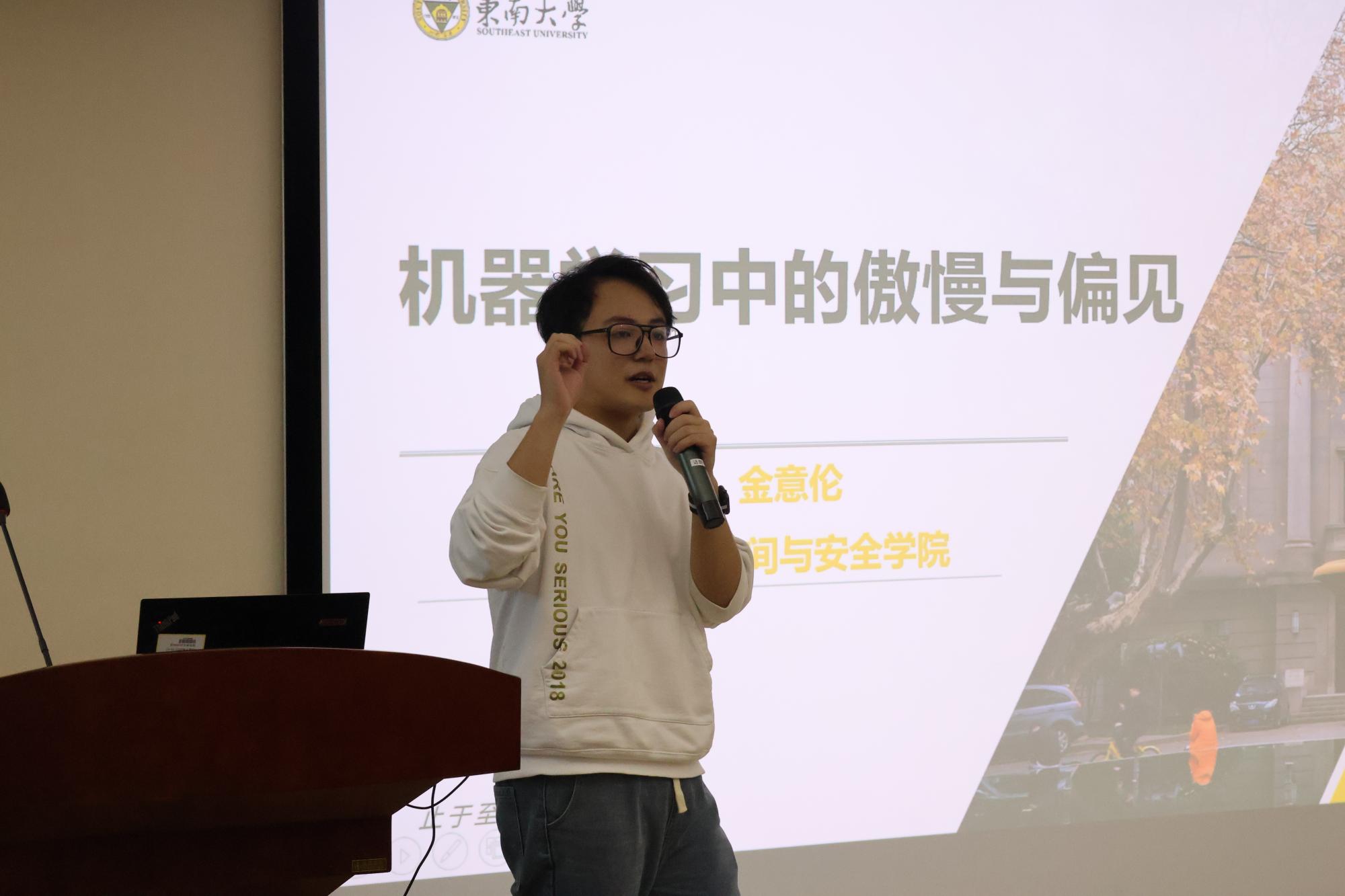 颁奖仪式后,三位获奖代表东南大学在读博士金意伦,浙江大学在读博士竺堃,浙江大学在读博士陈谦,分别向学弟学妹们分享了关于科研和考博方面的经验心得。金意伦员工针对当前人工智能的伦理公平问题,从宏观政策和微观应用角度详细介绍了人工智能伦理公平问题研究的必要性与迫切性,并分享了他近期的研究成果。竺堃员工为大家分享了自己阅读文献的心得,介绍了文献阅读的三次阅读法。陈谦员工分享了自己的申博经验,向大家介绍了申博前期准备、导师见面,及复试问题准备等。分享了对于“高质量论文”、“论文新颖度”的理解,希望尽快多发表高质量论文,为未来提供更多选择。