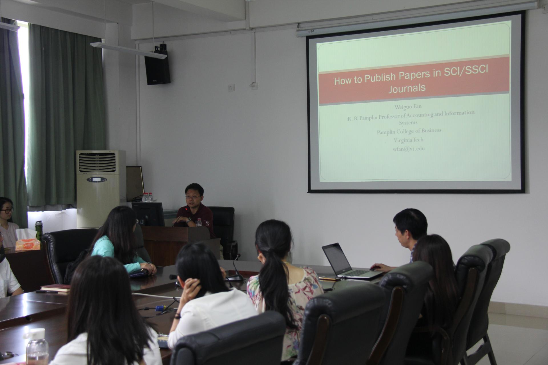 5月19日下午3:00,美国弗吉尼亚理工大学樊卫国教授在公司404会议室为全院师生带来了题为“SCI/SSCI论文写作与发表技巧”的讲座。信工公司近20余名科研骨干、研究生参加了本次讲座。讲座历时一个半小时,樊卫国教授用其生动的演讲,分享了其在顶级期刊发表论文的方法、技巧和经验