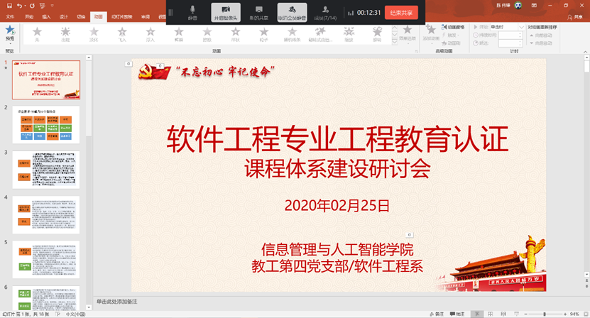 2月25日上午,公司软件工程专业召开了工程教育认证课程体系建设工作会议。受疫情的影响,本次会议采用线上会议的方式进行。会议由陈伟锋老师主持,软件工程专业课程体系相关任课教师参加本次会议。本次会议的研讨主题是课程体系建设工作中教学大纲的修订,包括课程目标的制定机制、课程目标对毕业要求的支撑关系分析、教学内容的适应调整、以及课程目标达成度计算方法等。经过上一学年对三门基础必修课程的试点建设工作的论证和分析,我们逐步掌握了工程教育工作中课程体系环节相关工作内容和机制,因此,本次会议将启动第二轮全面的课程体系建设工作。