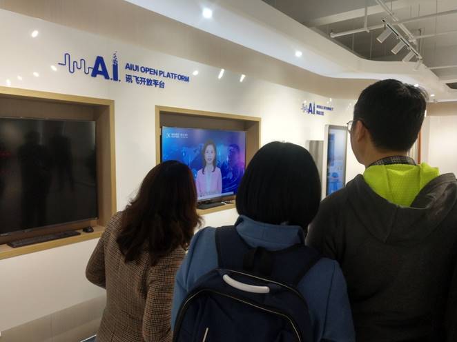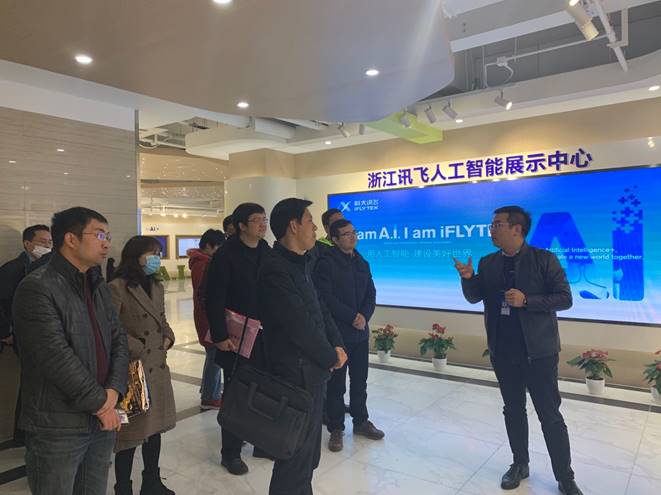 公司一行首先来到浙江讯飞人工智能展厅参观,展厅由讯飞开放平台、移动互联、智能家居、语音转写终端、AI+、智能汽车、讯飞幻境、智慧教育和智能机器人等项目组成。