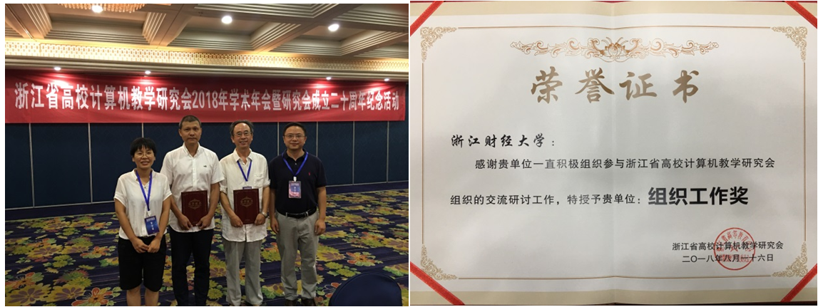 2018年8月16日,由浙江省高校计算机教学研究会主办、浙江大学城市公司承办的2018年浙江省高校计算机教学研究会学术年会暨研究会成立二十周年纪念活动在杭州举行。公司张文宇、王竹云、林剑、冯小青四位老师参加了此次教学年会。在本次年会上,公司参会教师发表了题为《多维任务驱动下财经类院校计算机基础课程改革与实践研究》和《软件工程与实践教学的实施》两篇教学研究论文。此外,由于公司长期以来积极参与浙江省高校计算机教学研究会组织的交流研讨工作,在本次研究会成立二十周年纪念活动中被授予组织工作奖。