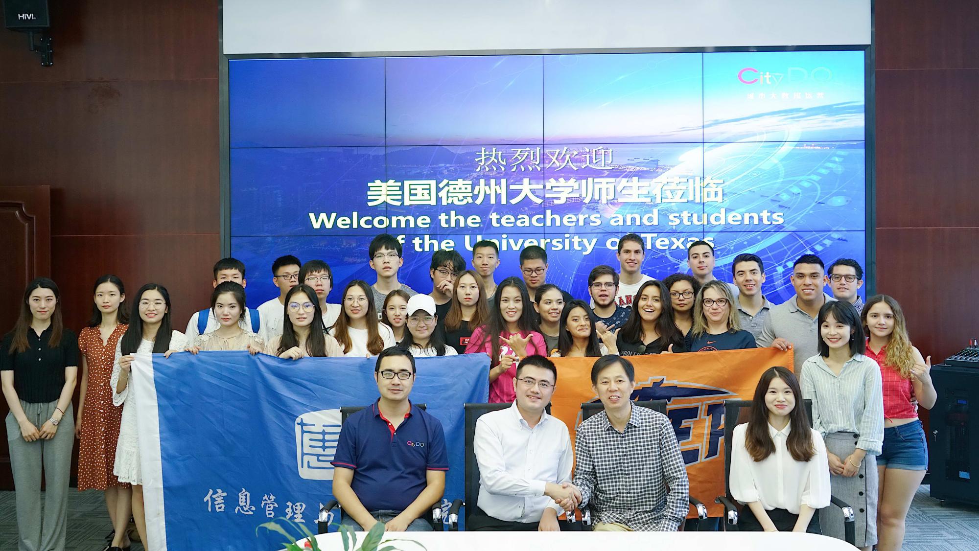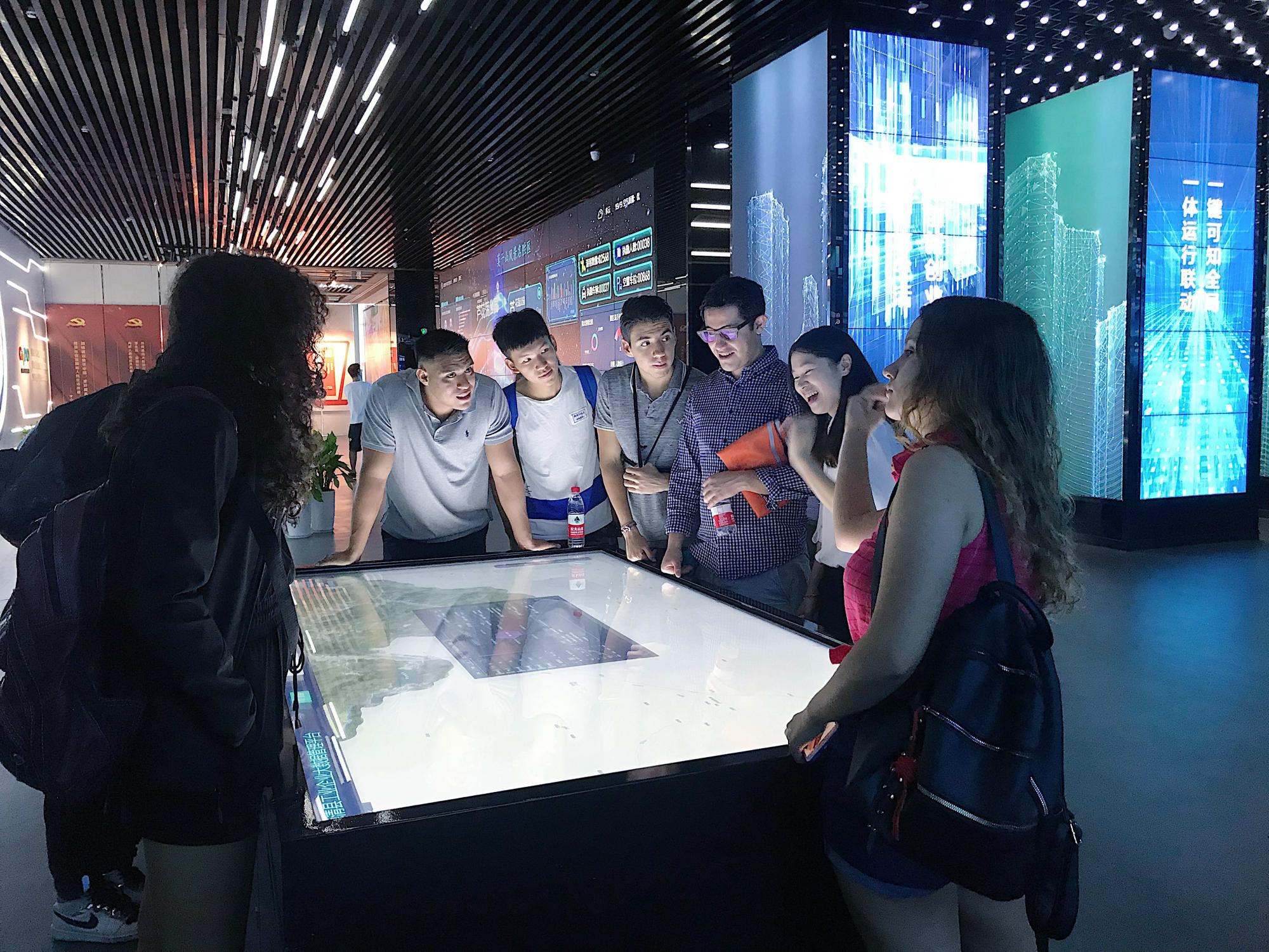 2019年7月10日星期三上午,在公司副经理张帅教授的带领下,商务智能中美暑期班的14名美国德州大学员工和16名信工公司员工参观了杭州城市大数据运营有限公司位于德清的智慧城市展示中心。