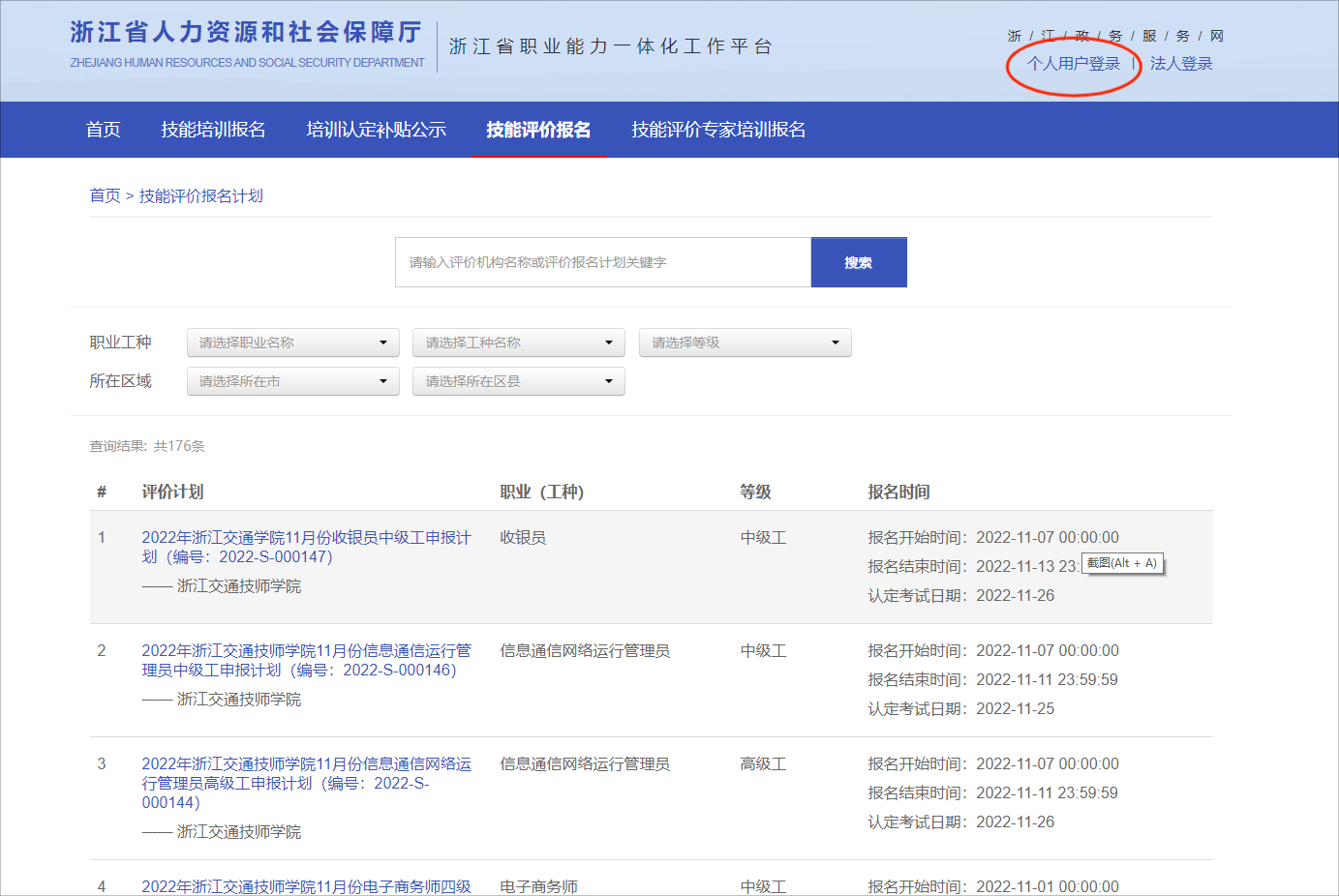 (三)选择【个人登录】,考生如果在浙江政务网已经注册过,可使用原来的账号信息登录,如果没有注册过,请按要求先注册成功后再申报