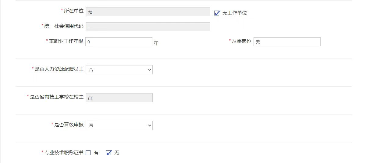 3.考生在填写个人报名信息时,考生来源分为社会人员和院校员工;在校老员工统一勾选为“院校员工”,所在单位均勾选“无工作单位”,“本职业工作年限”、“从事岗位”等均填“0”、“无”或“否”。