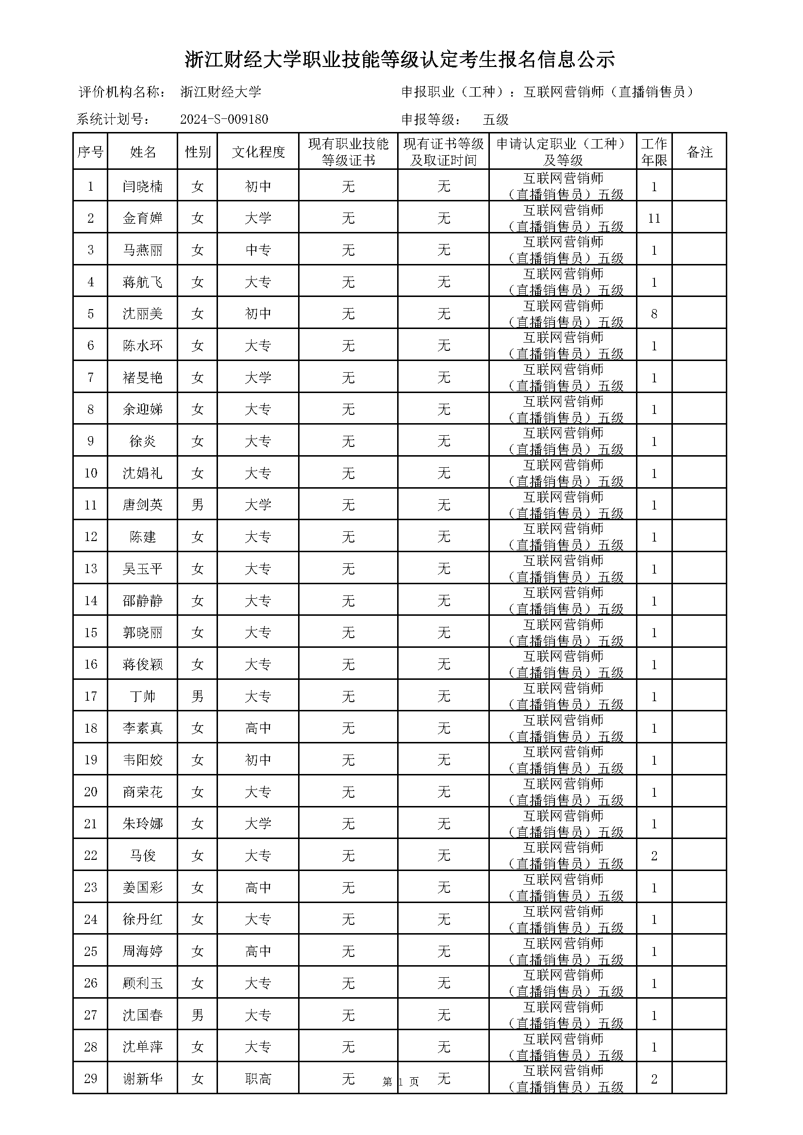 闫晓楠等共29名人员,经互联网营销师(直播销售员)五级职业技能等级认定考生资格审核,符合申报条件,现予以公示(详细名单见附图)。公示时间为2024年9月14日至20日。公示期间,如有异议,请以电话或书面方式向我中心反映,联系电话:0571-86735783