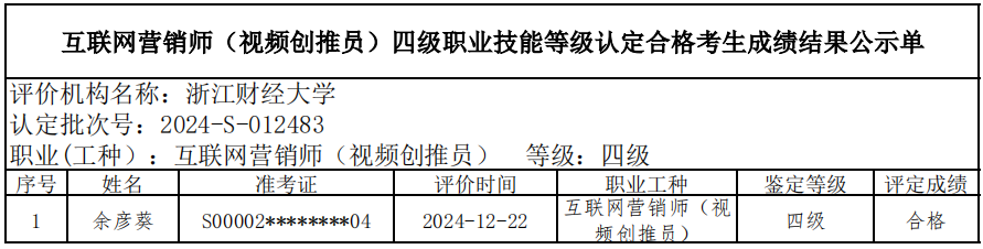 七、关于编号:2024-S-012483互联网营销师(视频创推员)四级职业技能等级认定成绩合格人员结果公示单