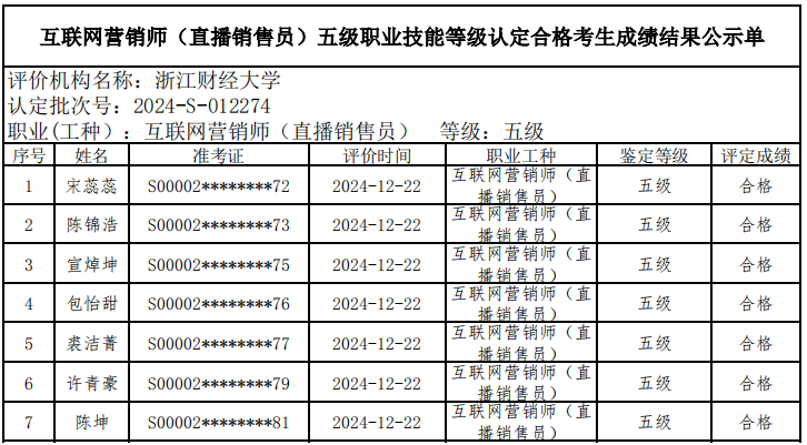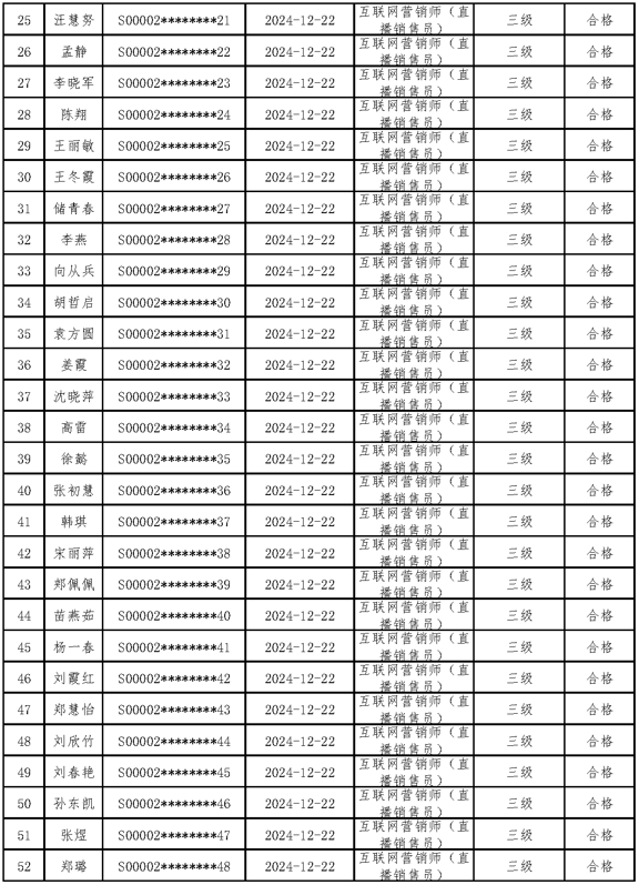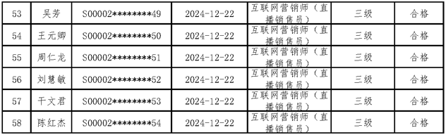 三、关于编号:2024-S-012274互联网营销师(直播销售员)五级职业技能等级认定成绩合格人员结果公示单
