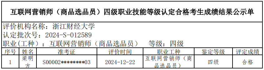 五、关于编号:2024-S-012589互联网营销师(商品选品员)四级职业技能等级认定成绩合格人员结果公示单